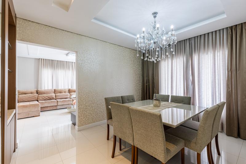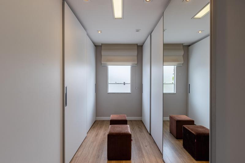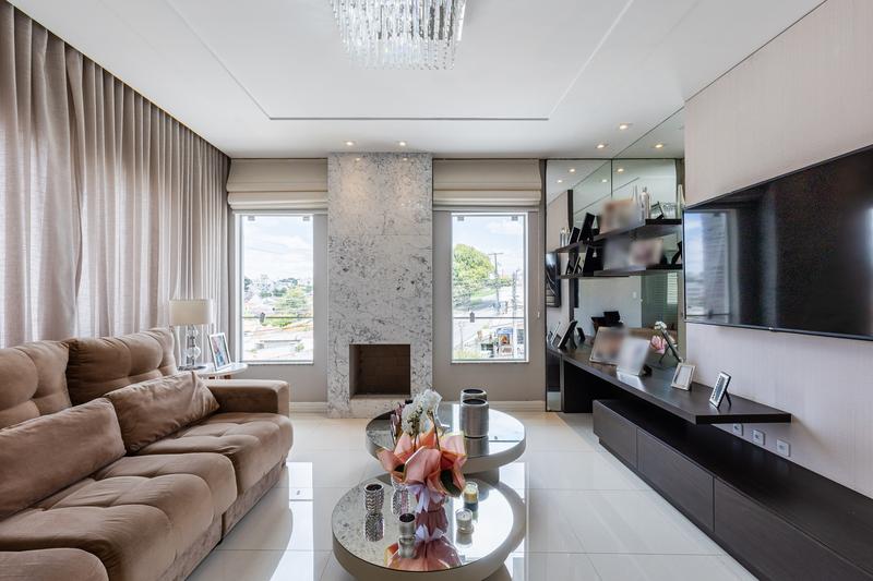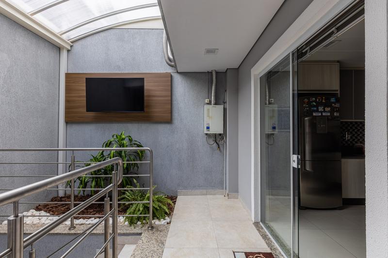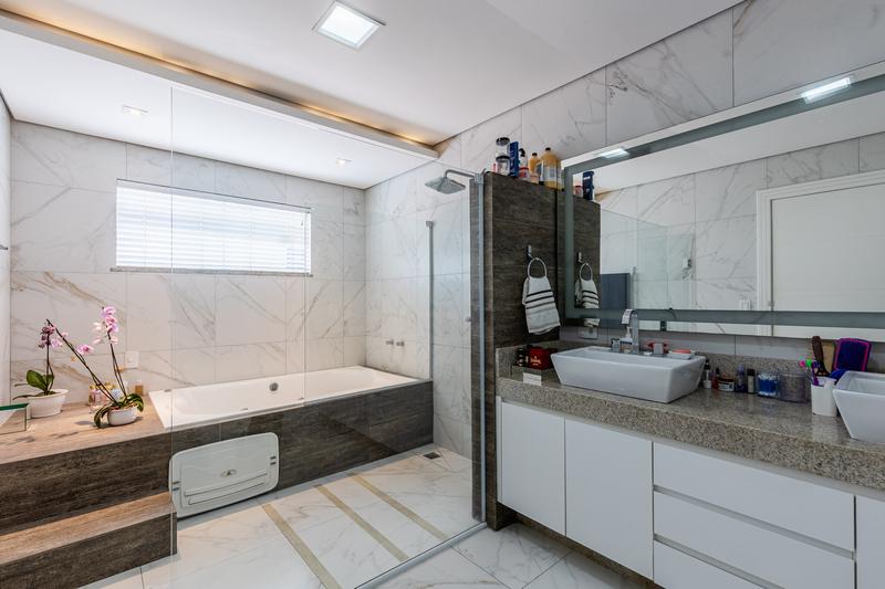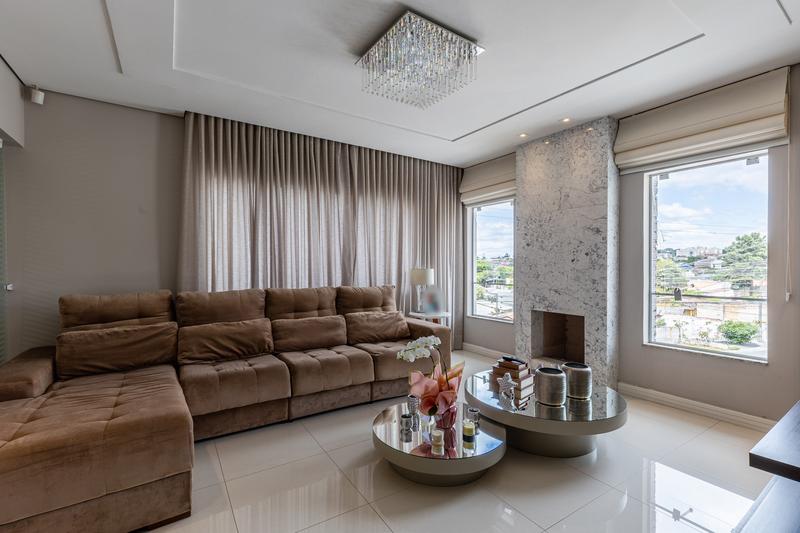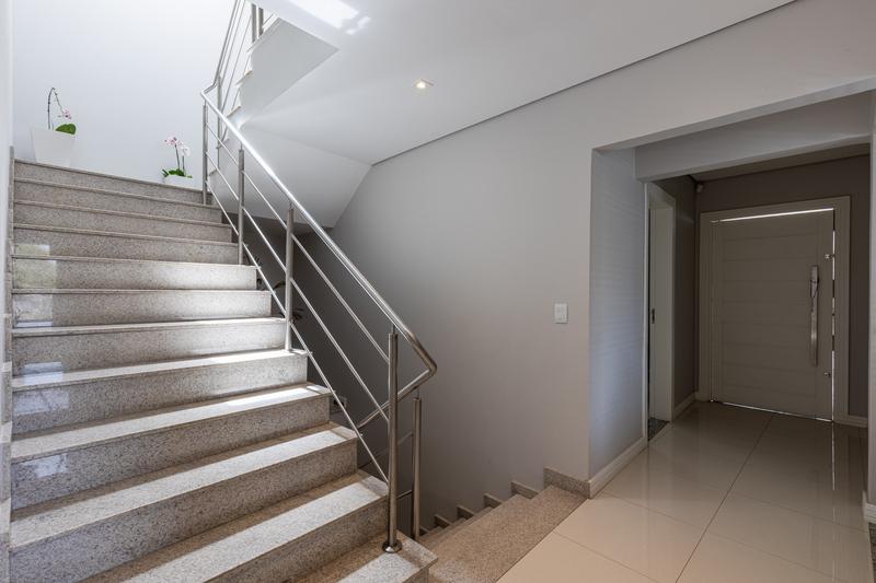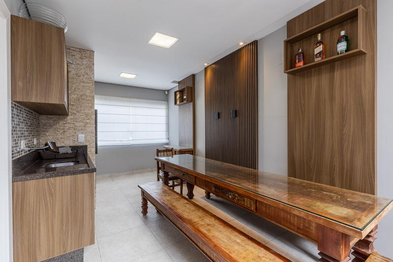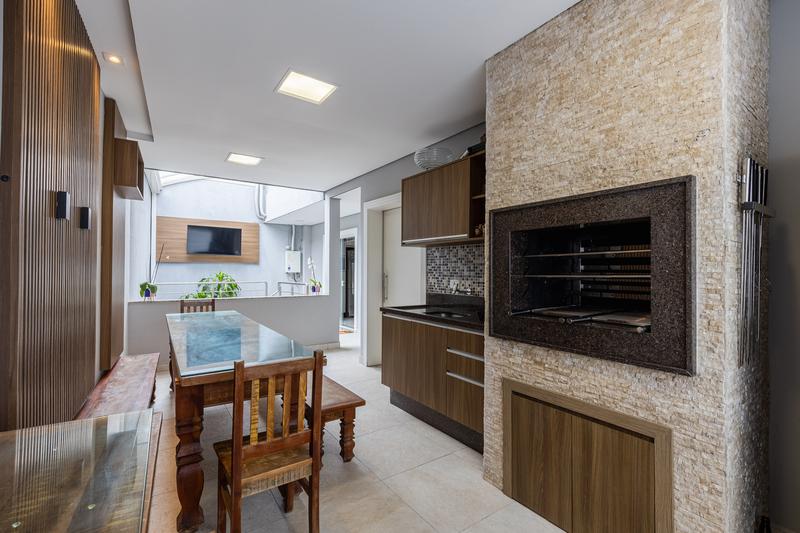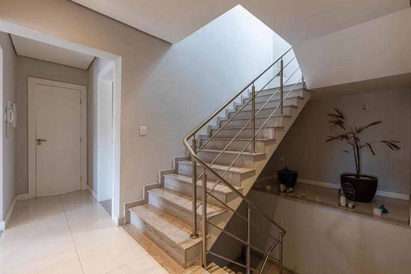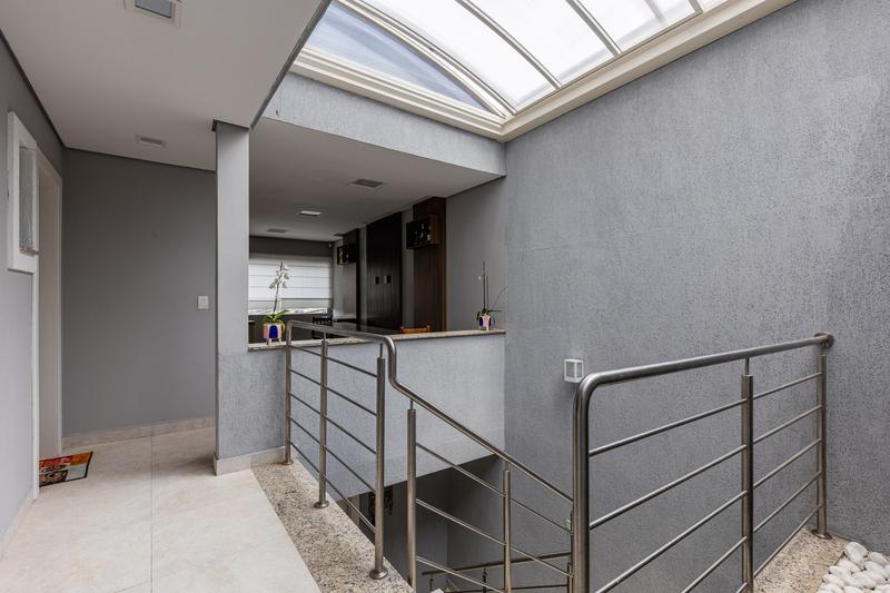 No segundo pavimento, encontram-se uma aconchegante sala de estar com lareira, uma ampla sala de jantar, escritório com estante e um banheiro social com box em vidro e tampo em mármore. O ambiente conta ainda com um espaçoso espaço gourmet, equipado com churrasqueira, bancada em granito e banheiro de apoio, além de um jardim de inverno com teto retrátil. A cozinha é ampla, com armários planejados, bancada em granito, cooktop, coifa e porta de correr em vidro, integrando praticidade e modernidade. Todo o pavimento possui piso em porcelanato.