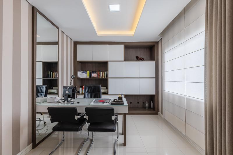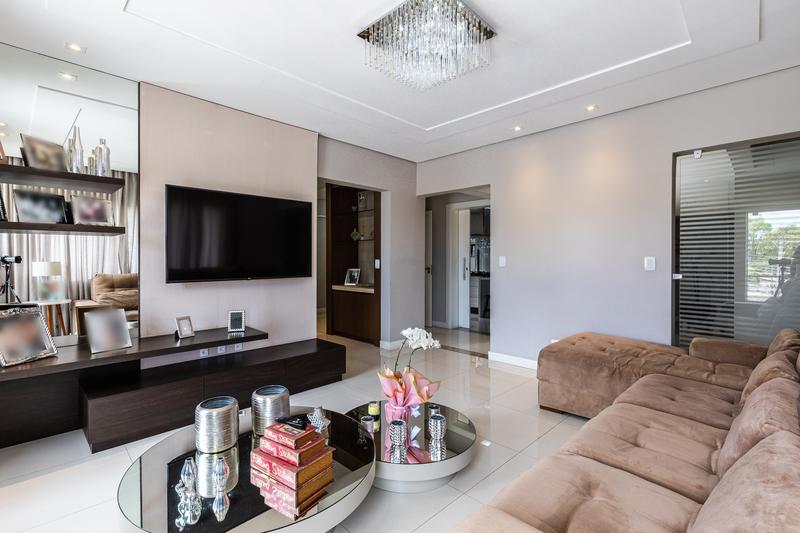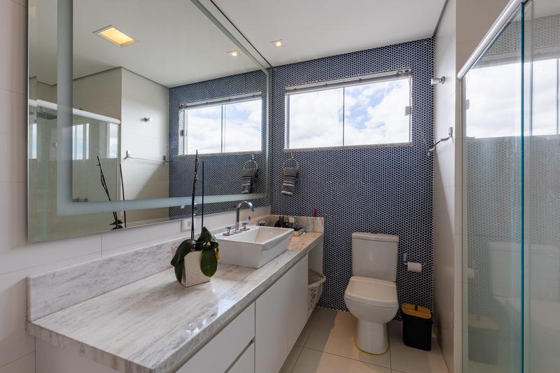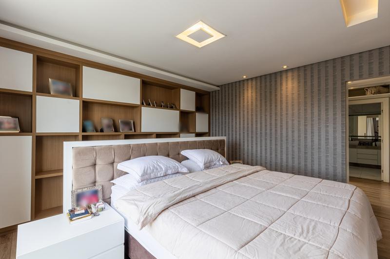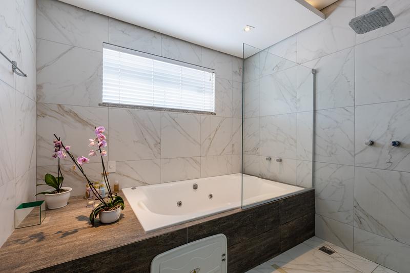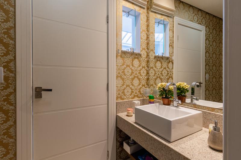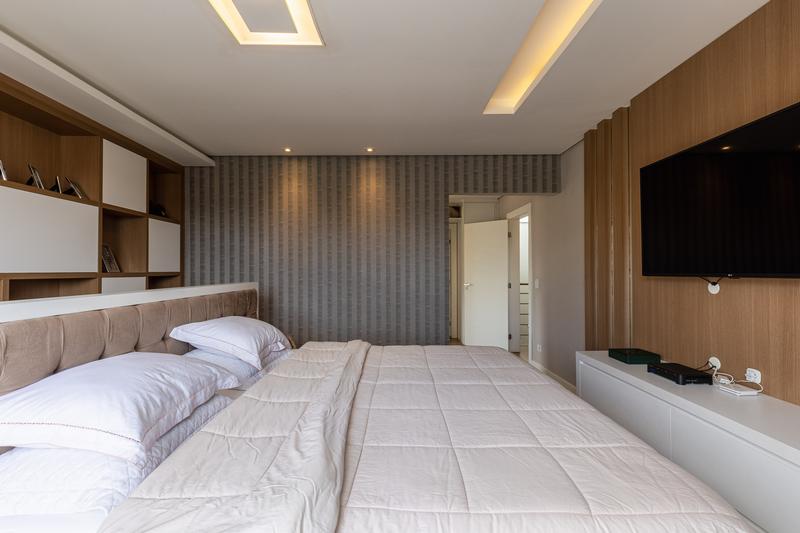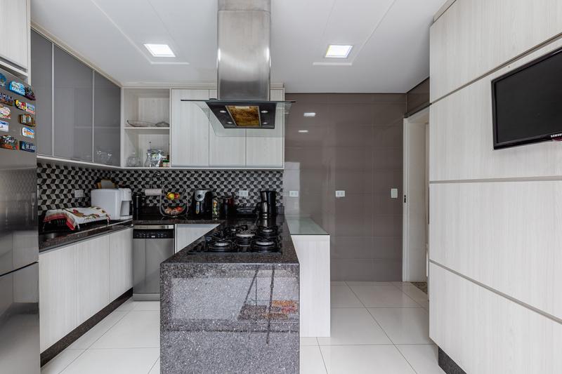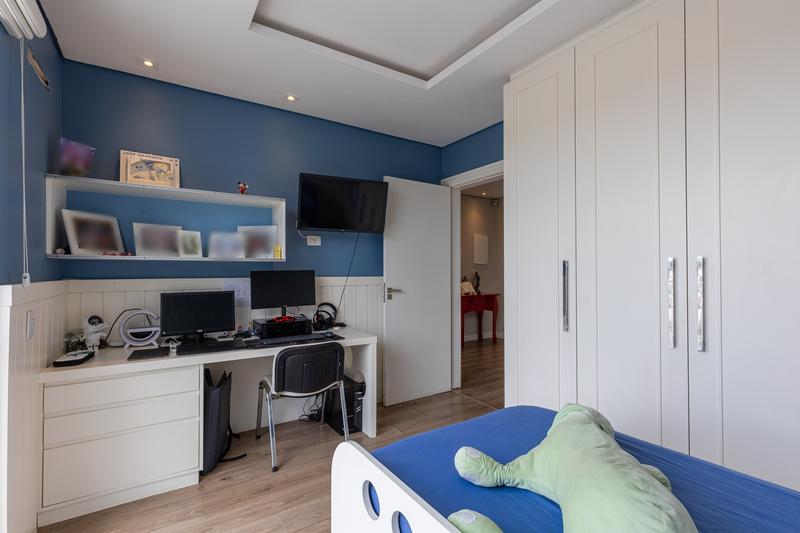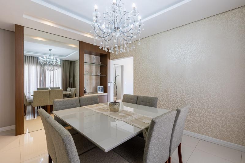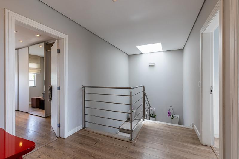 No segundo pavimento, encontram-se uma aconchegante sala de estar com lareira, uma ampla sala de jantar, escritório com estante e um banheiro social com box em vidro e tampo em mármore. O ambiente conta ainda com um espaçoso espaço gourmet, equipado com churrasqueira, bancada em granito e banheiro de apoio, além de um jardim de inverno com teto retrátil. A cozinha é ampla, com armários planejados, bancada em granito, cooktop, coifa e porta de correr em vidro, integrando praticidade e modernidade. Todo o pavimento possui piso em porcelanato.
