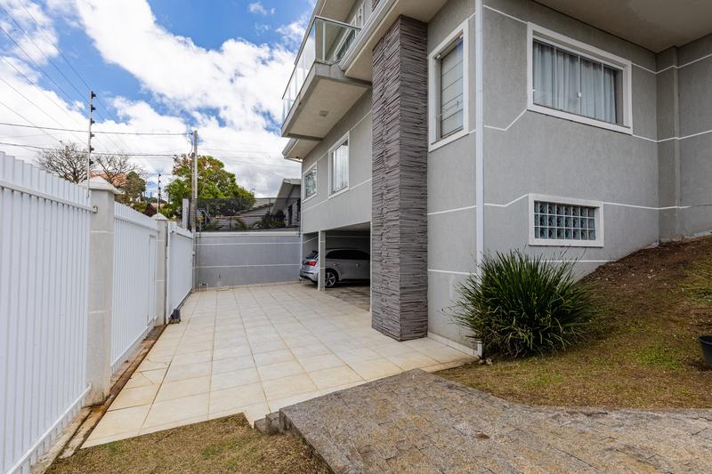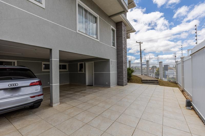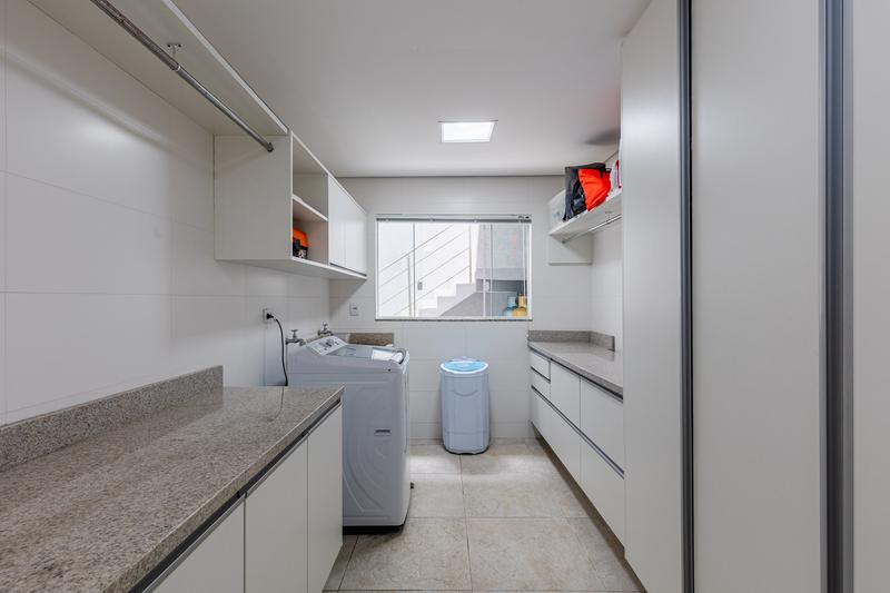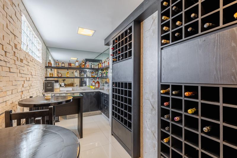 O pavimento térreo dispõe de hall de entrada, lavanderia com armários, bar com adega, pia e bancada em granito, além de um banheiro social. A garagem é coberta para três carros, com vagas adicionais no estacionamento.