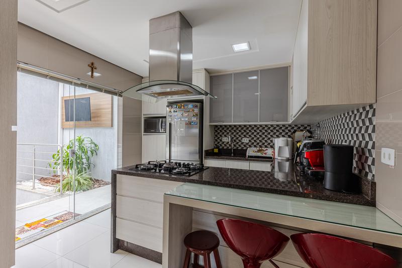 A residência possui ar-condicionado em todos os ambientes, teto rebaixado em gesso com iluminação embutida, sistema completo de segurança com alarme, câmeras e cerca elétrica, portão automático, jardim e acabamento externo em grafiato.