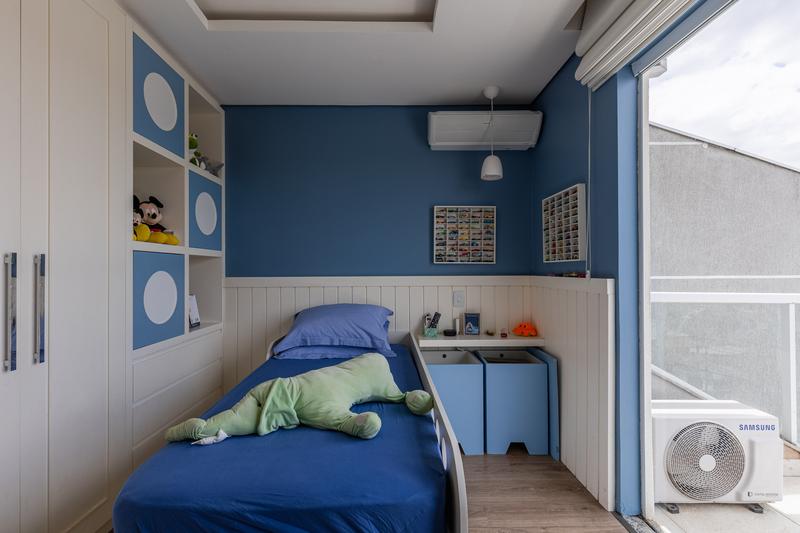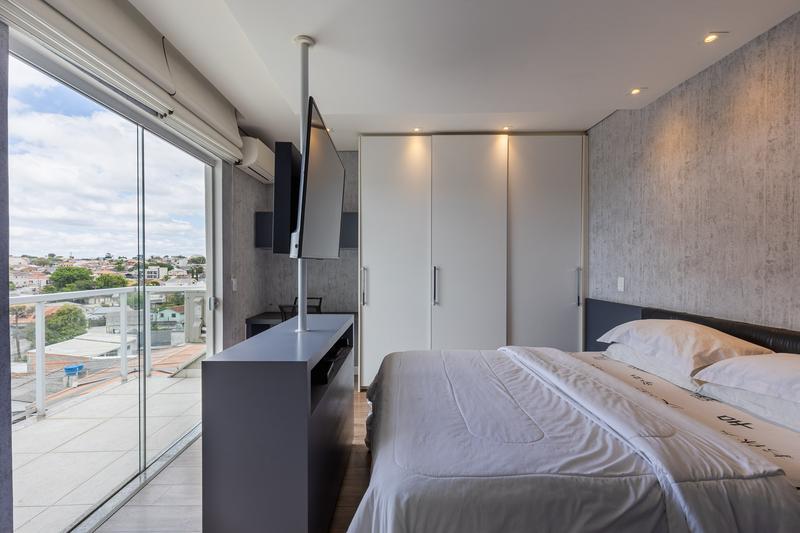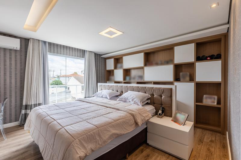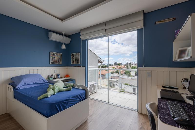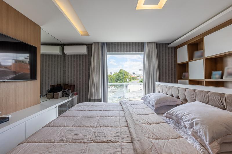 No pavimento superior, a casa conta com um amplo hall e três dormitórios, sendo uma suíte máster com sacada, ar-condicionado, closet com armários planejados e banheiro com hidromassagem. Os outros dois dormitórios também possuem sacadas, armários embutidos e ar-condicionado. O banheiro social tem acesso compartilhado com a suíte. O piso é laminado e as escadas em granito, garantindo sofisticação e durabilidade.