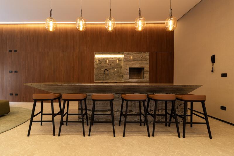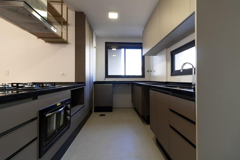 – Suíte com armários planejados, painel para TV, espelho grande, balcão e cortina automatizada corta-sol.