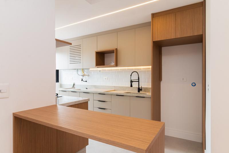 Cozinha planejada estruturada com pia, armários, cooktop e forno embutido