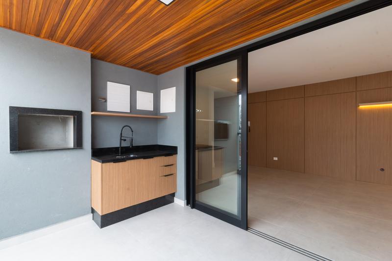 Sacada funcional contendo churrasqueira, pia e balcão para momentos de lazer