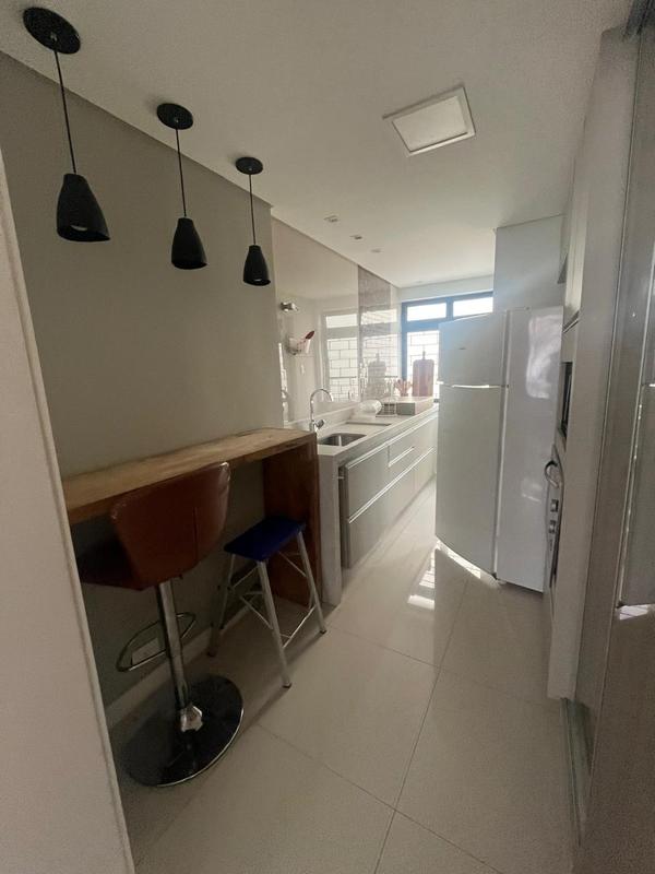 Cozinha equipada com luminárias pendentes, balcão com 02 banquetas, armários planejados e eletrodomésticos