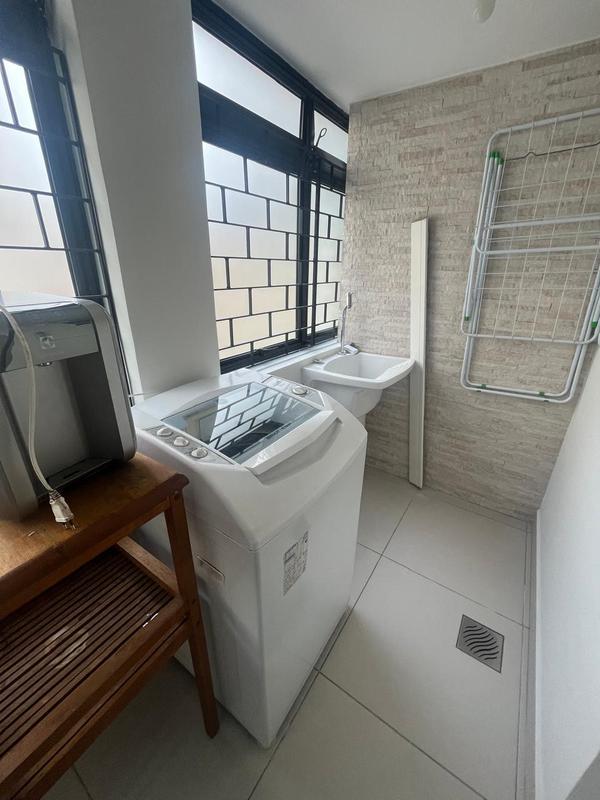 Área de serviço individualizada com armário embutido, máquina de lavar, filtro de água e tanque