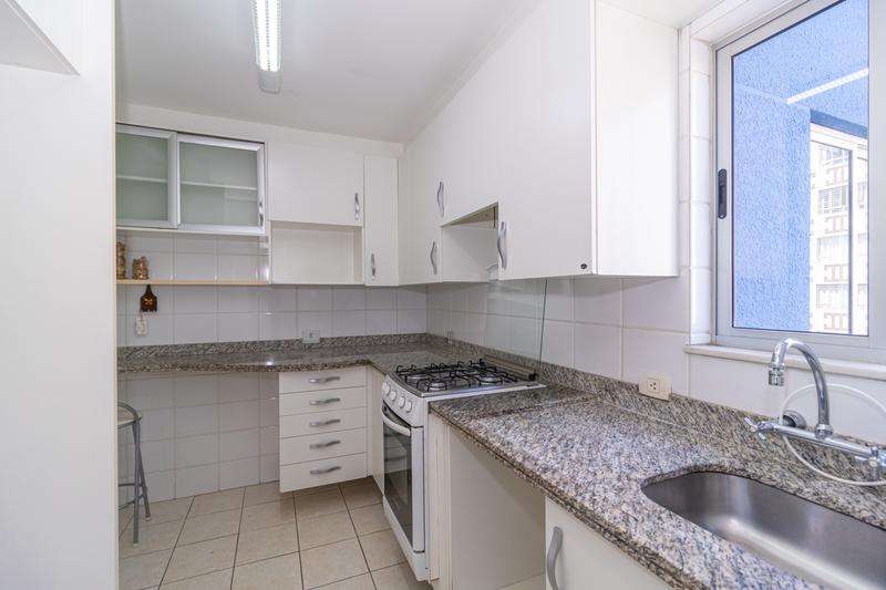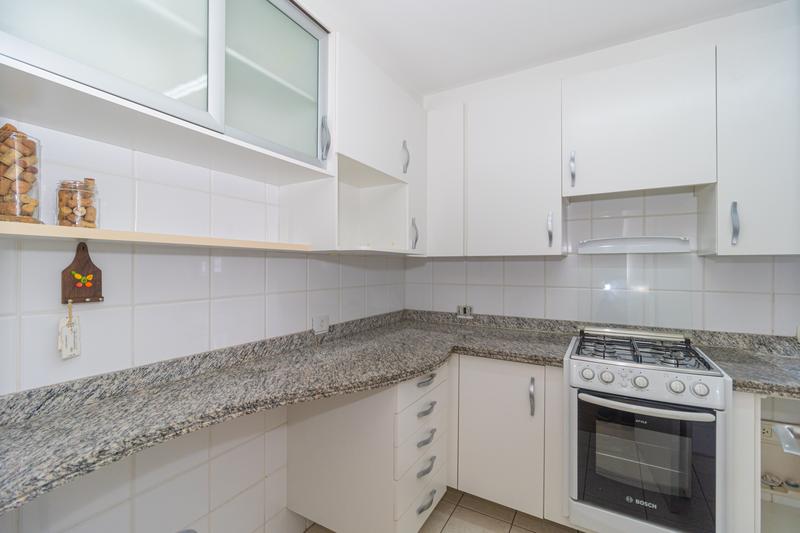– Cozinha com armários embutidos, fogão e bancada em granito ampla, janela próxima da pia, tornando a cozinha mais iluminada e arejada