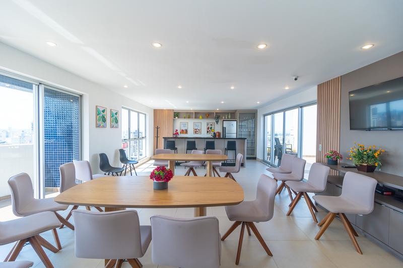 – Sala ampla com armário, mesa de jantar, sofá, Painel de TV com armário e varanda ampla fechada em vidro com churrasqueira