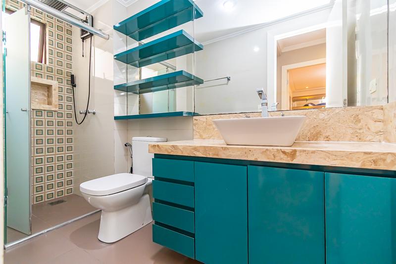 – 01 banheiro social com armário e box em vidro;