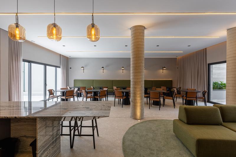 O prédio conta também com a Praça Franco Giglio, um espaço para convivência e contemplação com a obra de arte restaurada do artista Franco Giglio.