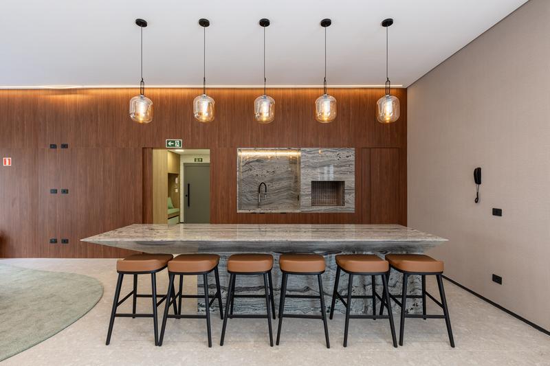 O prédio também conta com a Praça Franco Giglio, um espaço para convivência e contemplação com a obra de arte restaurada do artista Franco Giglio.