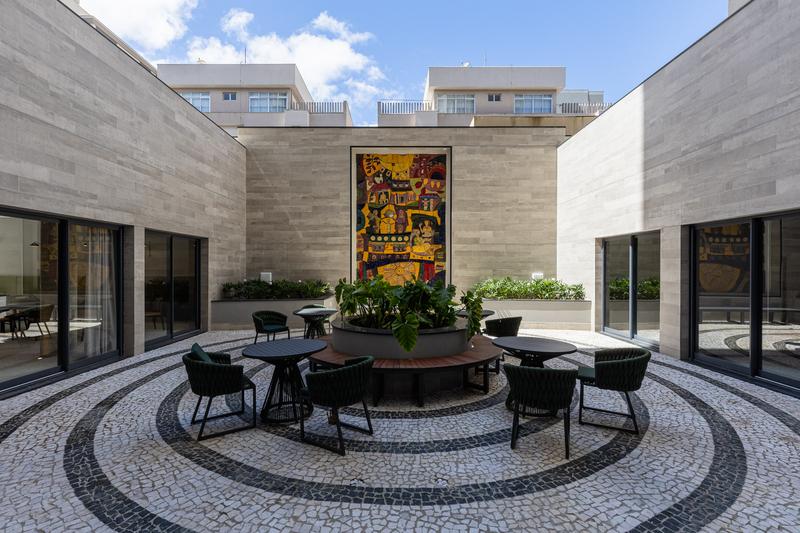 O prédio também conta com a Praça Franco Giglio, um espaço para convivência e contemplação com a obra de arte restaurada do artista Franco Giglio.