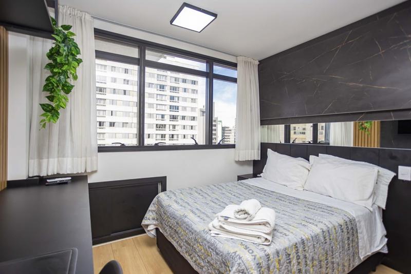 Apartamento de 01 quarto com armário, cama de casal e persiana;
