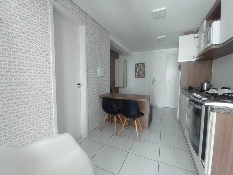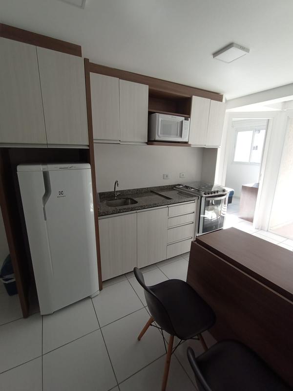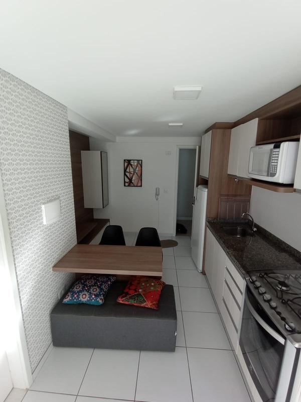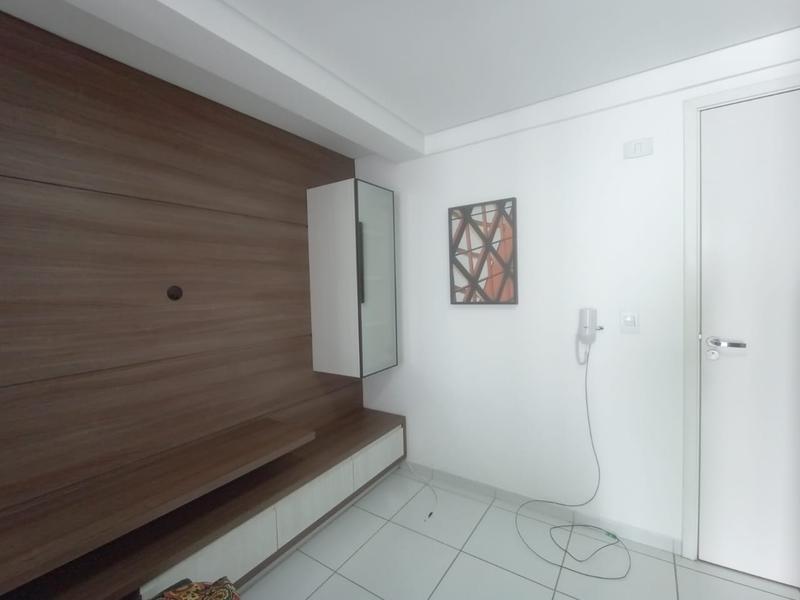 01 Sala e cozinha integradas: Armários planejados, mesa, sofá, painel para tv, micro-ondas e geladeira;