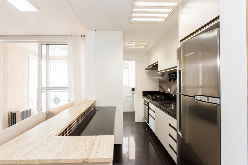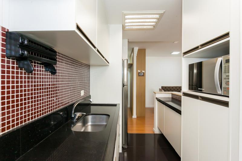 A cozinha é totalmente equipada, com armários planejados e eletrodomésticos (exceto máquina de lavar), integrada à sala de jantar com mesa e cadeiras, criando um ambiente acolhedor e funcional.