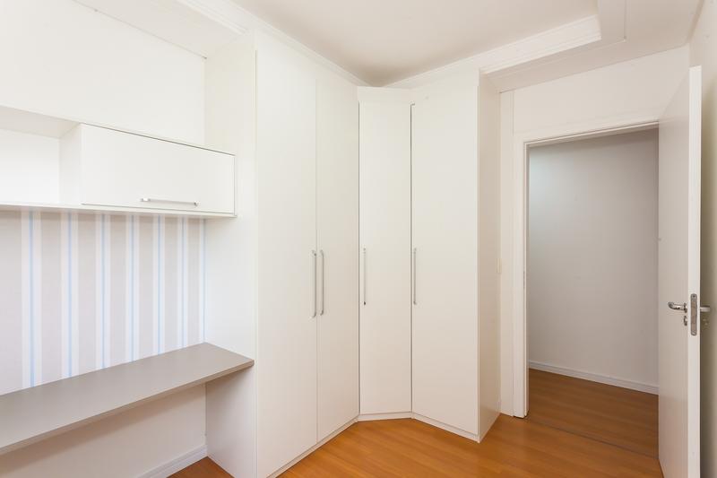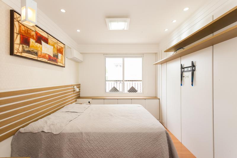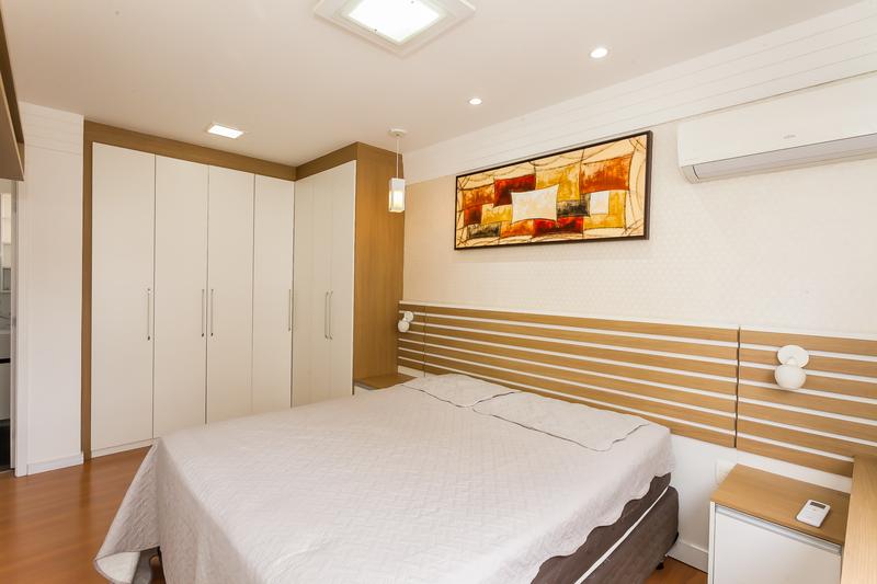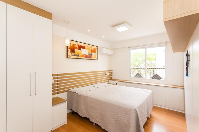 São 3 dormitórios, sendo 1 suíte, todos com armários embutidos. O quarto de casal conta com cama completa, e o quarto de solteiro também já está mobiliado.