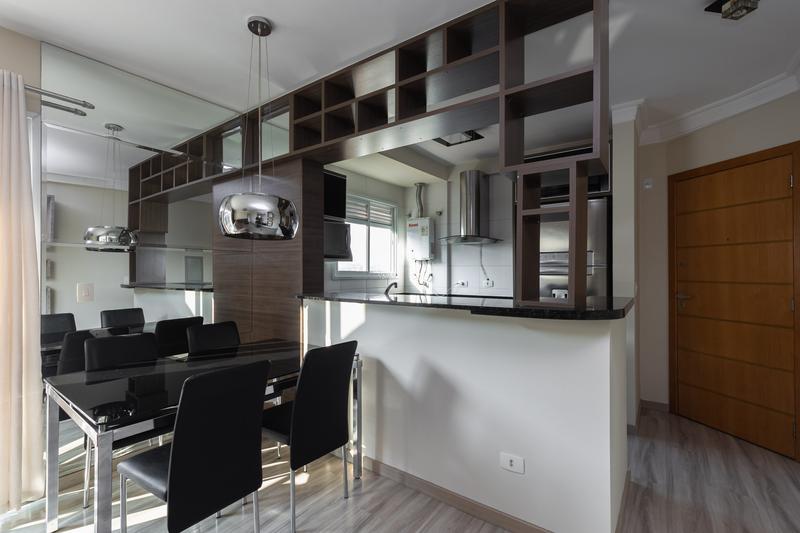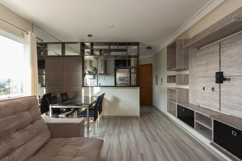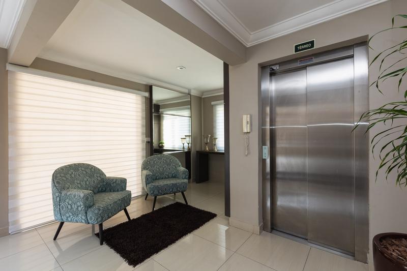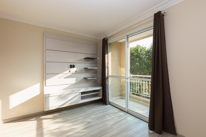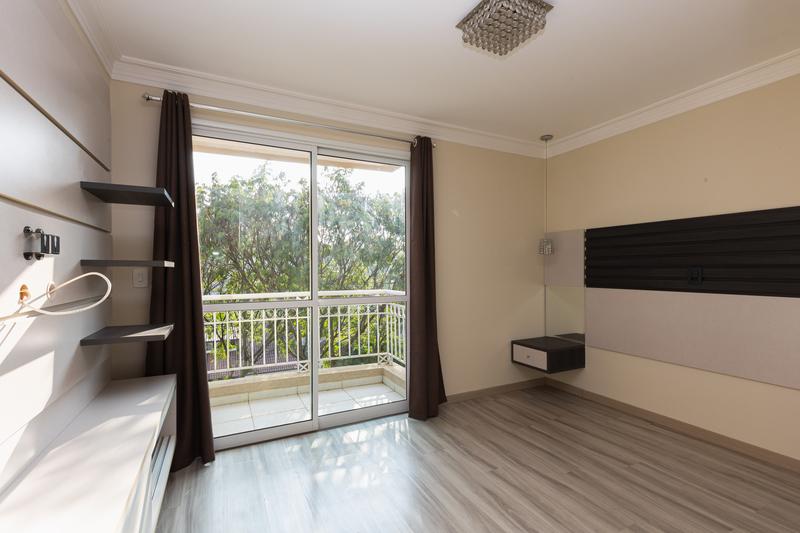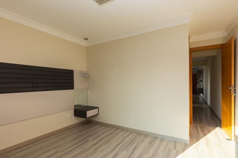 – Quarto (Suíte) com espelho, paínel para TV, cortinas, piso laminado e porta de correr em vidro.