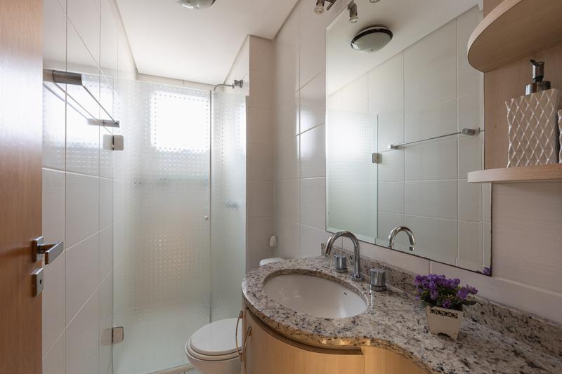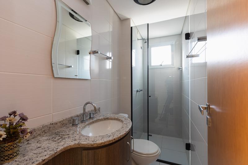 – Banheiro social com box, pia com tampo em granito, ducha e espelho.