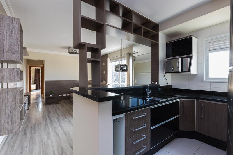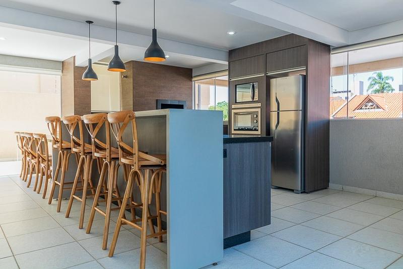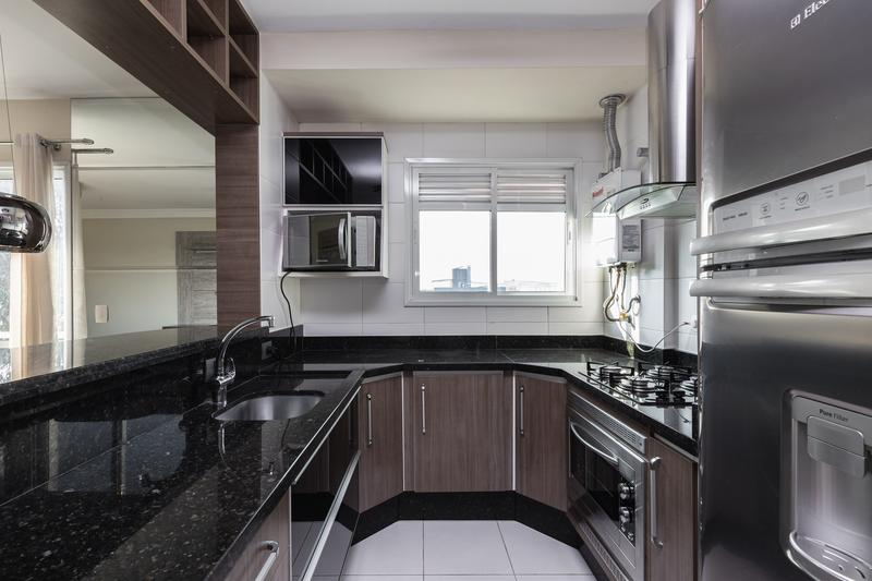 – Cozinha com armários planejados, forno embutido, cooktop, geladeira, luminárias, pia com tampo em granito, coifa inox, central de gás e passa prato.