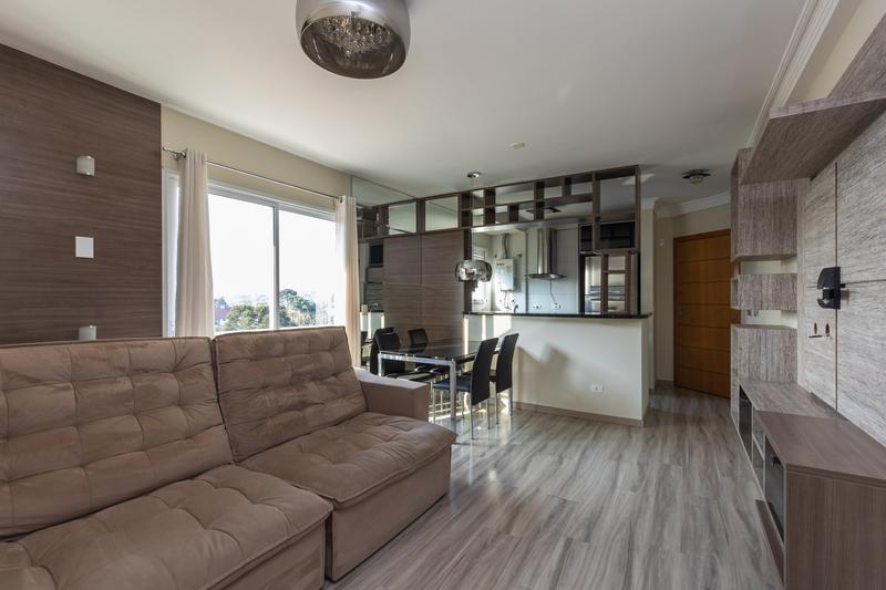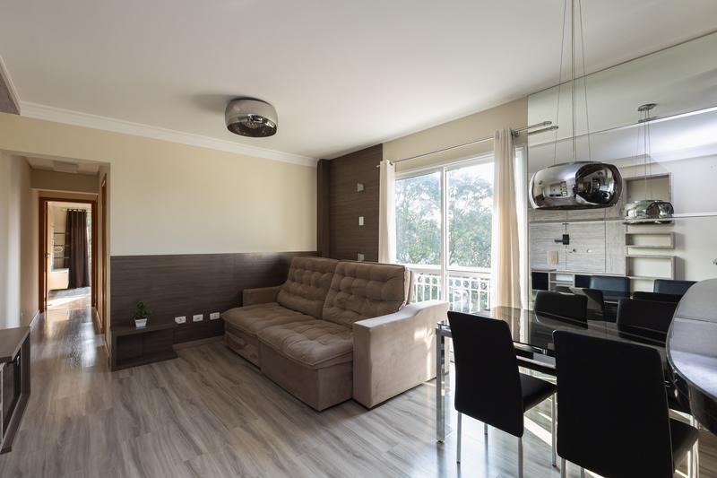– Sala ampla para dois ambientes, piso laminado, sanca em gesso, painel para tv, sofá, mesa com 4 cadeiras, cortinas e sacada.