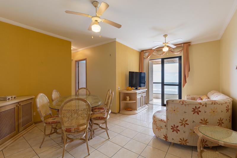 O Apartamento está localizado 7º andar da Torre F – Margarita, frente para o mar, composto por 3 quartos, sendo uma suíte, sala de estar e jantar, sacada com churrasqueira, cozinha, área de serviço e garagem coberta, sendo que o apartamento está totalmente mobiliado.