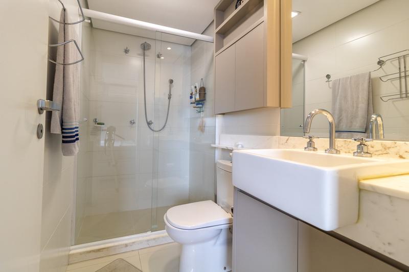 * Banheiro moderno: com ducha a gás, espelho, armário suspenso planejado, nichos e pia em cerâmica.