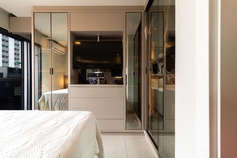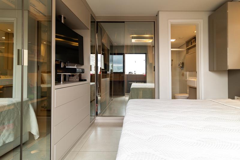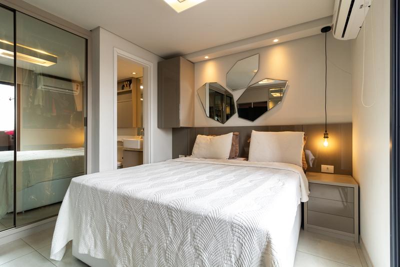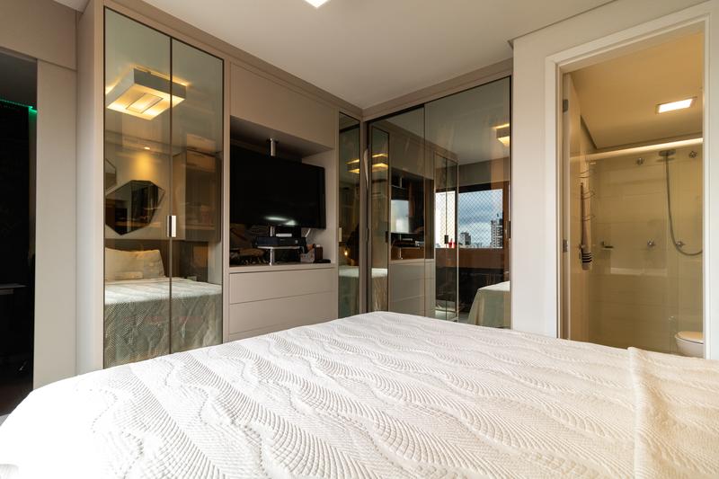 * Quarto funcional: com móveis planejados, espelho grande, teto rebaixado com luminárias, ar-condicionado, TV giratória para o quarto e sala, cama box de casal com baú, cabeceira com criado-mudo e armário suspenso no canto.