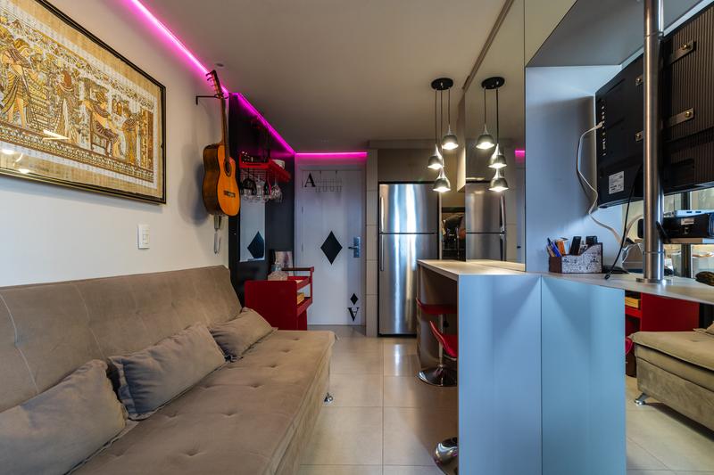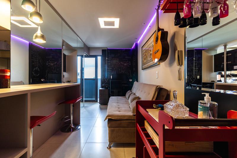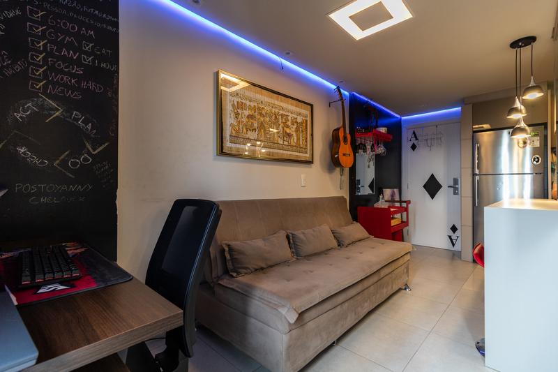 * Sala aconchegante: com sofá cama, luminárias, mesa para computador, balcão, cadeira de escritório e duas banquetas. Piso porcelanato e teto rebaixado com iluminação embutida.