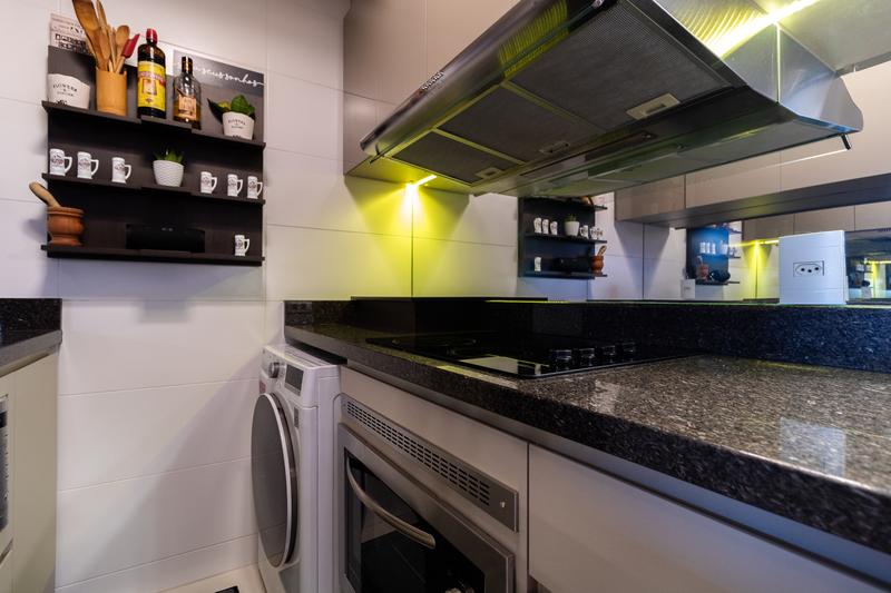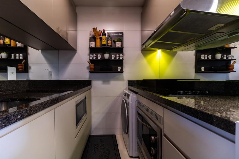 * Cozinha equipada: com armários planejados, pia com tampo em granito, micro-ondas, forno elétrico, fogão elétrico, geladeira inox, balcão e armários suspensos planejados. Além disso, conta com máquina de lavar e secar embutida e até aspirador de pó.
