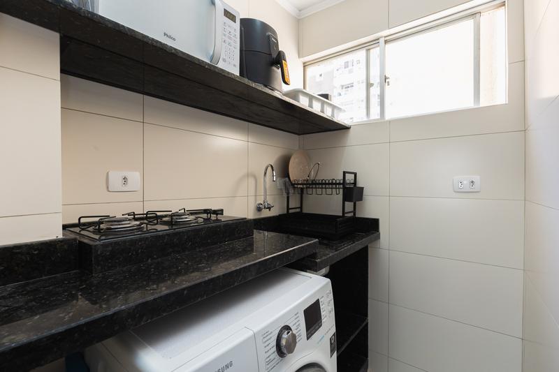 Cozinha, que já vem equipada com armários, micro-ondas e máquina de lava e seca, proporcionando um ambiente prático para o dia a dia.
