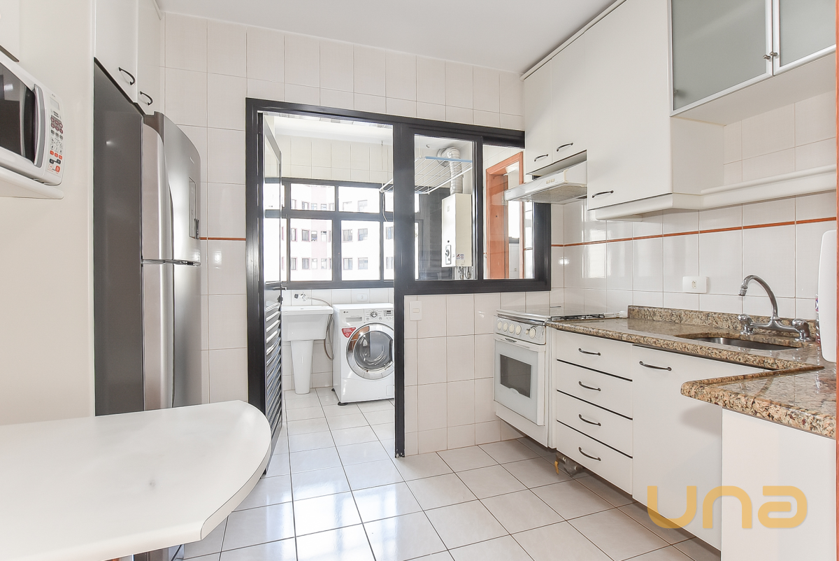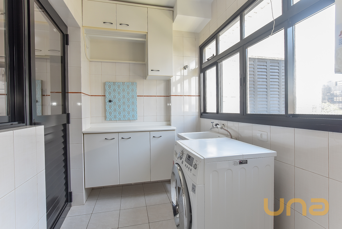 A cozinha é completa, equipada com geladeira, micro-ondas, fogão, lava-louças, sugar e armários planejados. A área de serviço dispõe de banheiro e máquina de lavar.