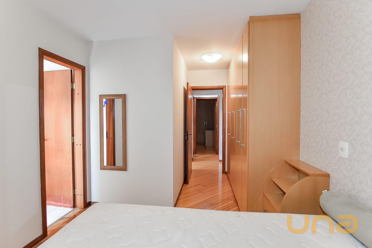 O apartamento conta com 3 quartos amplos, sendo 1 suíte. A sala de estar está totalmente mobiliada com sofá, cristaleira, mesa e cadeiras, além de uma sacada com churrasqueira elétrica. Os dormitórios possuem camas, armários e cortinas em todas as janelas, garantindo privacidade.