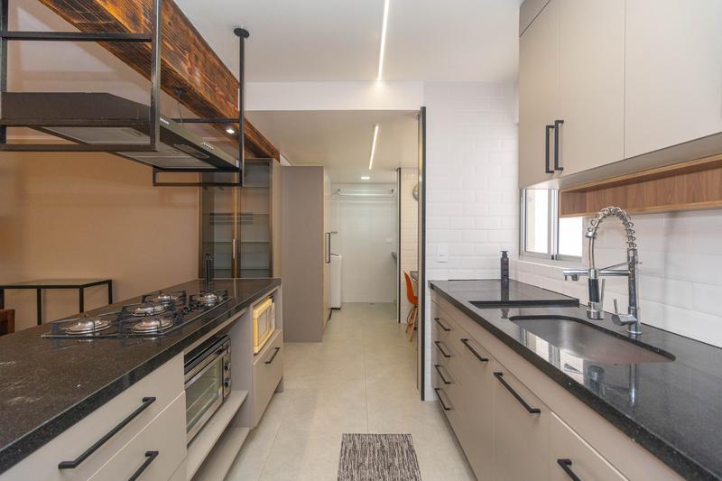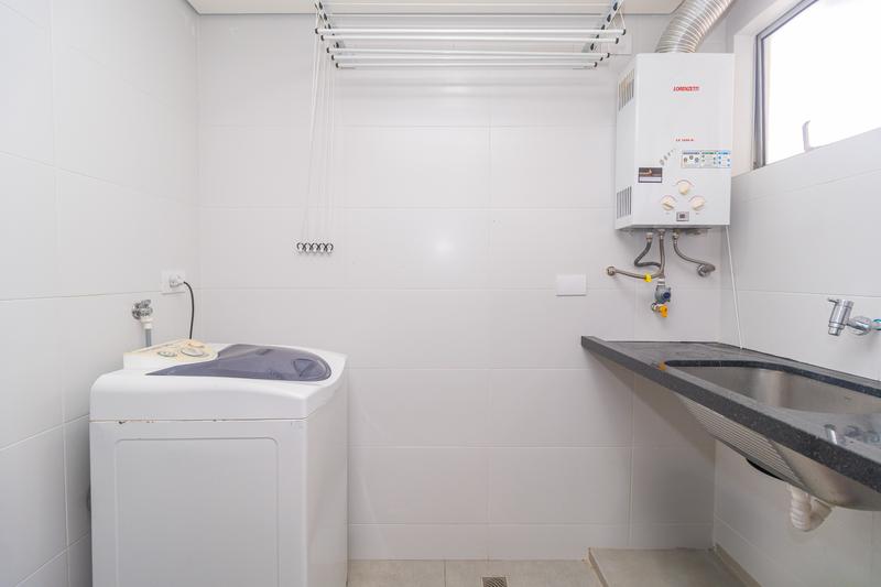 A cozinha é completa, com armários planejados, geladeira, purificador de água, ilha com cooktop, forno elétrico, micro-ondas, depurador de ar e bancada em granito para refeições rápidas. A lavanderia é anexa, equipada com armários, tanque embutido e máquina de lavar.
