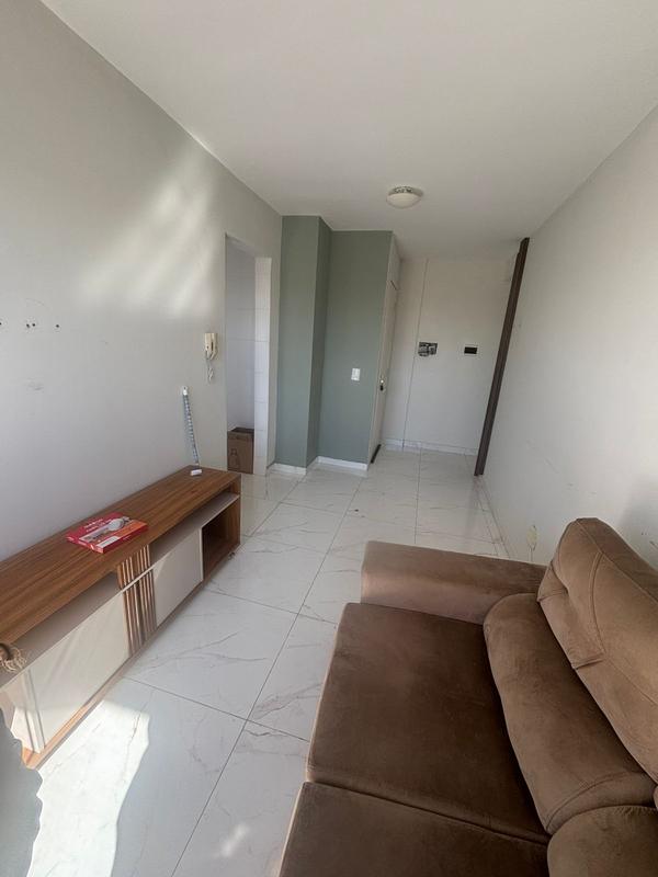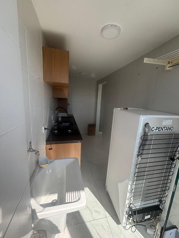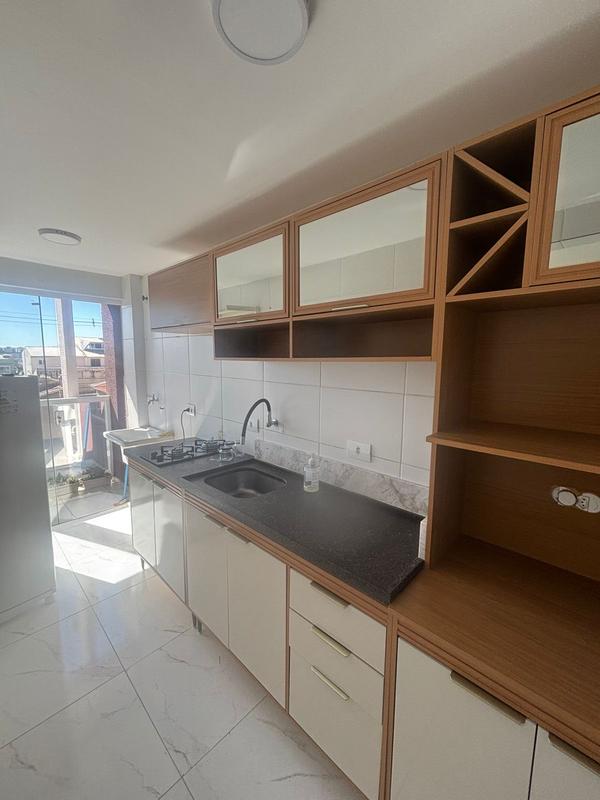 Sala com rack e sofá, dois quartos com armários, cozinha com armários, cooktop duas bocas e geladeira, sacada com churrasqueira e lavanderia.