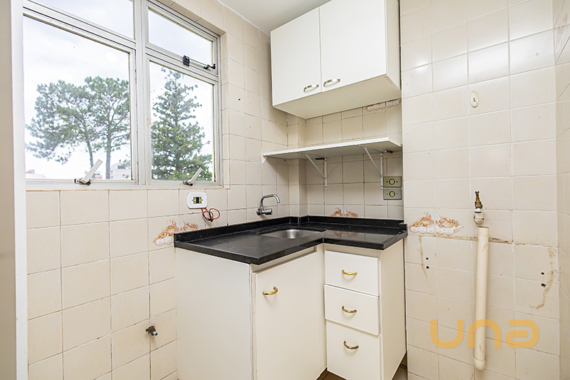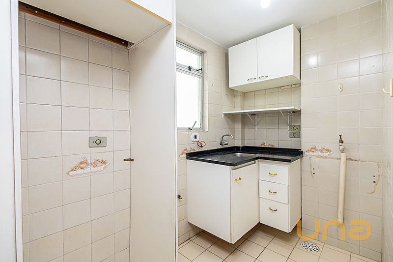 Cozinha conjugada com área de serviço com armário, pia e balcão;