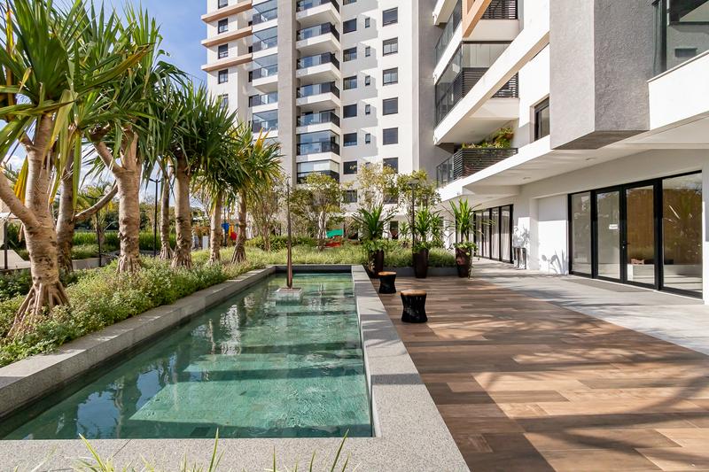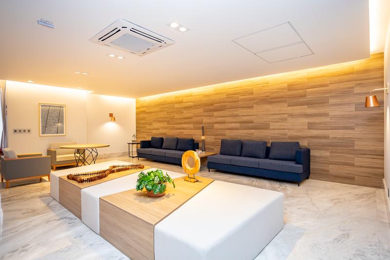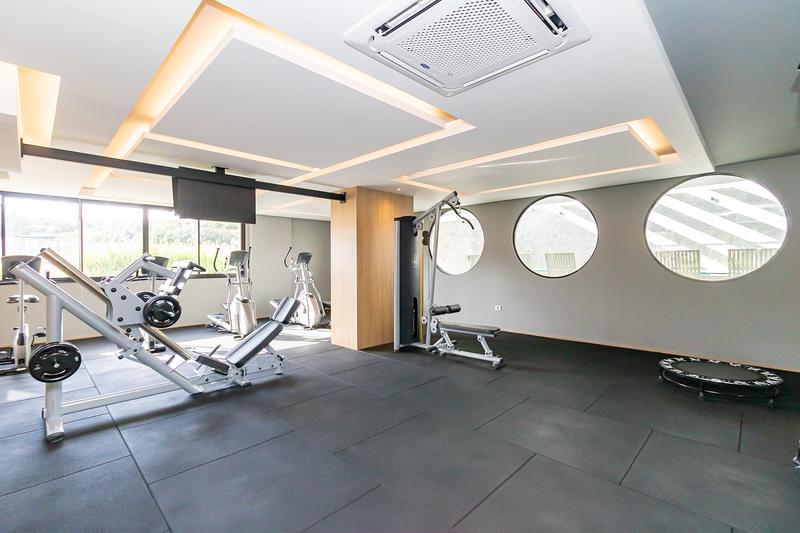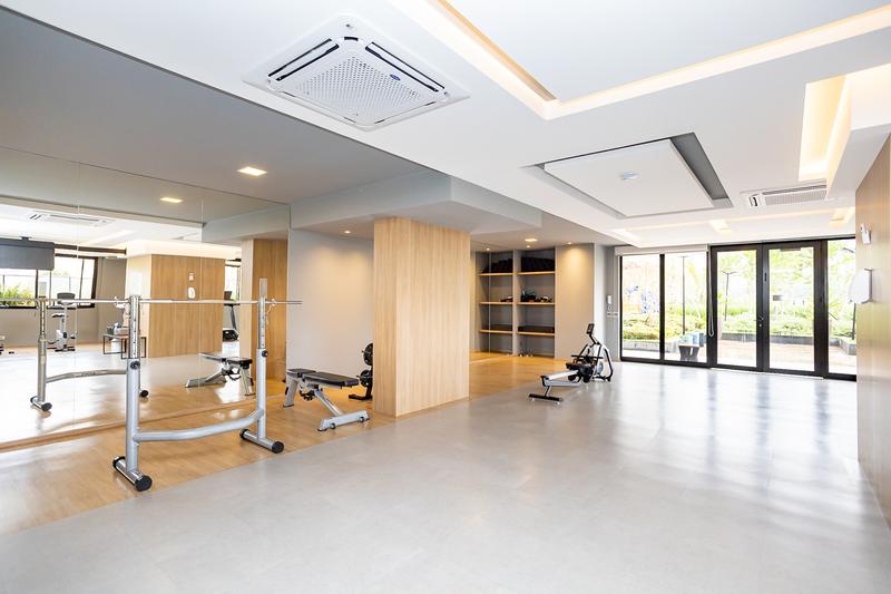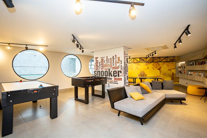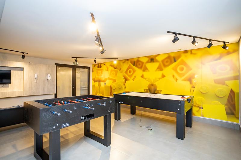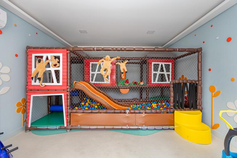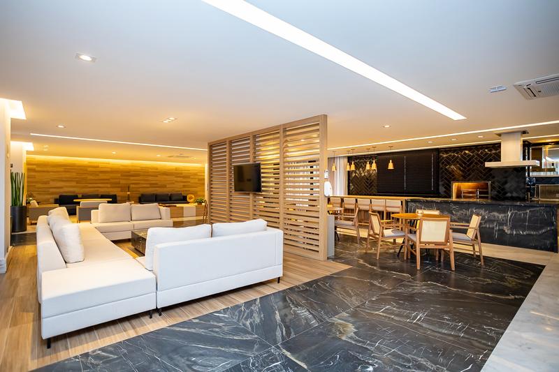– Sala para 2 ambientes, possui mesa, sofá, ar condicionado e possui acesso para varanda com churrasqueira a carvão e pia,