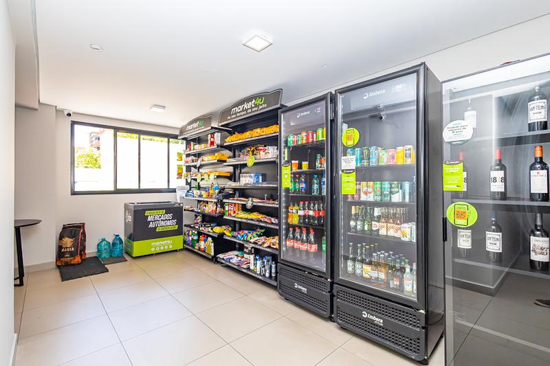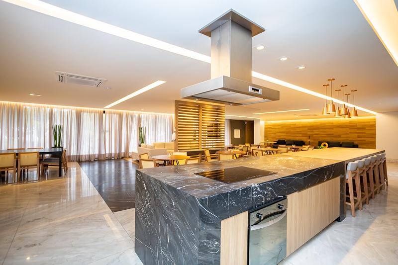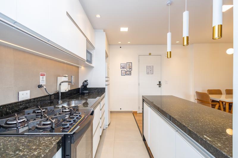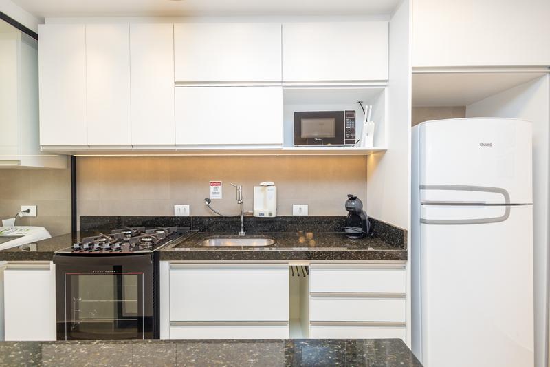 – Cozinha em conceito aberto com armário planejados, geladeira, fogão e micro-ondas,