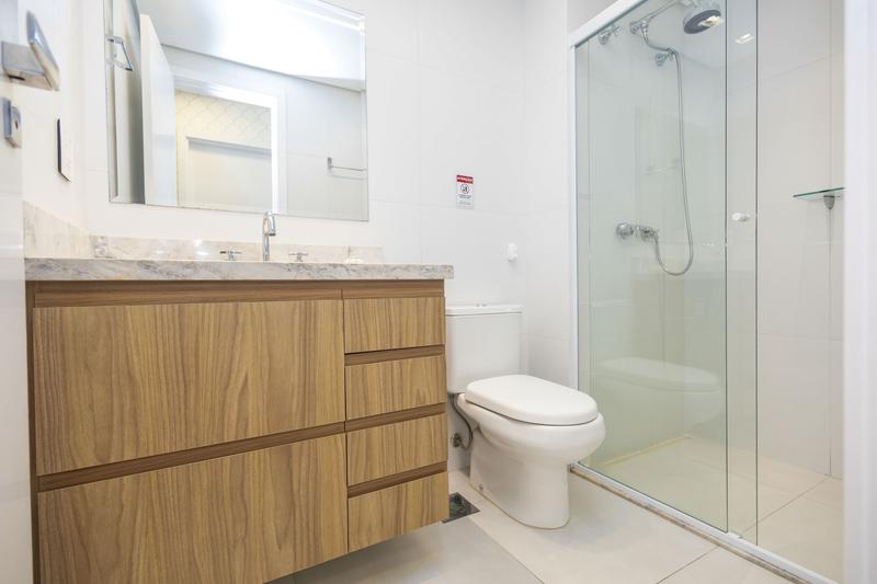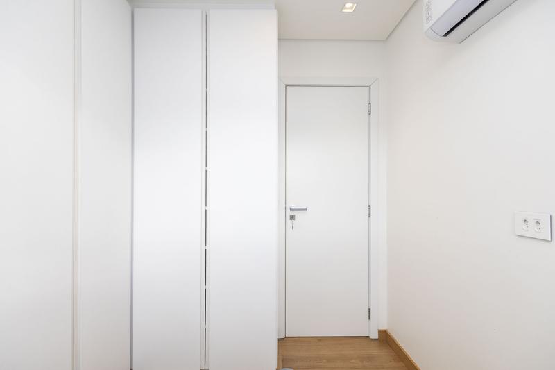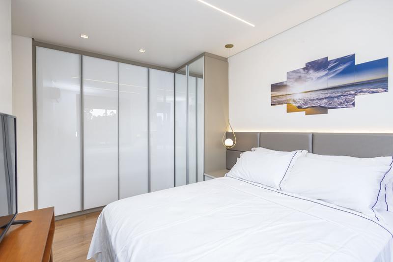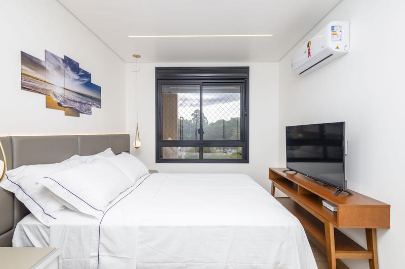 – 2 Quartos sendo uma suíte com armário planejado, cama box queen, cabeceira, mesinhas de cabeceira e ar condicionado, outro com armário planejado, cama box solteiro e ar condicionado,
