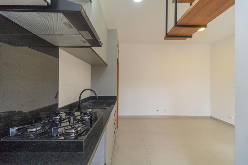 – Cozinha em conceito aberto, com armários planejados, cooktop e depurador,