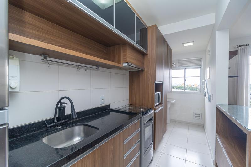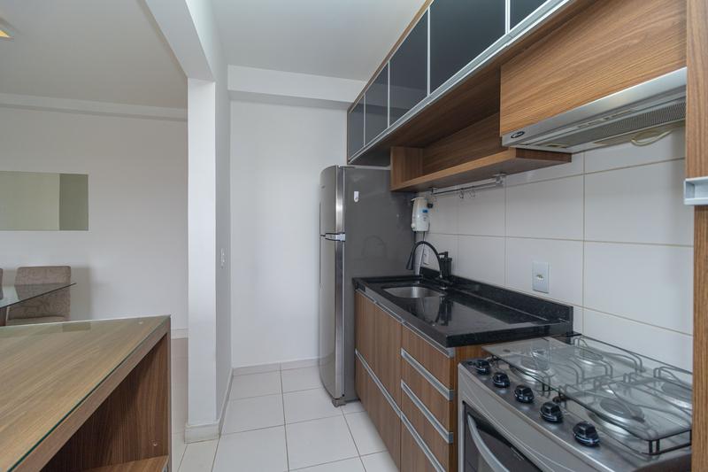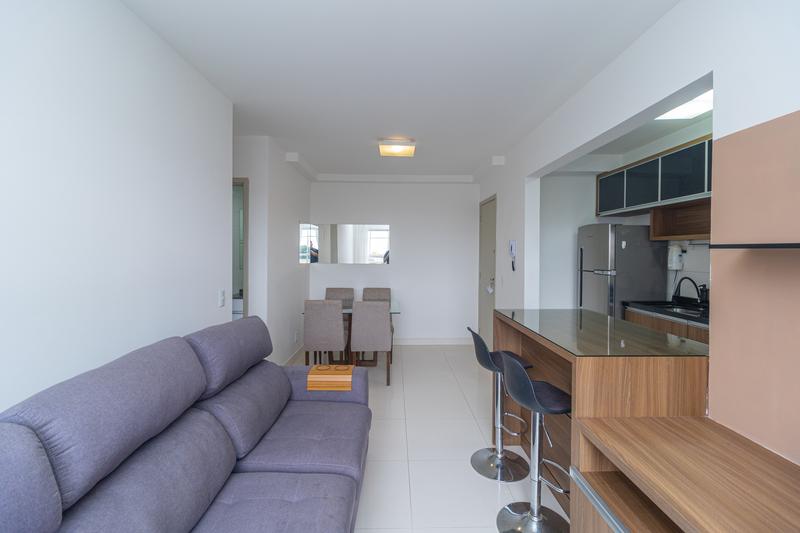 O imóvel conta com sala para dois ambientes, equipada com mesa para 4 lugares com tampo em vidro, sofá e rack. A cozinha em conceito aberto dispõe de armários planejados, fogão, depurador, geladeira, micro-ondas e bancada com banquetas, integrando praticidade e funcionalidade ao espaço.