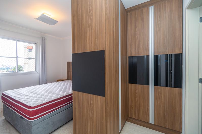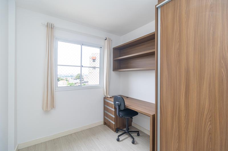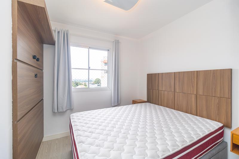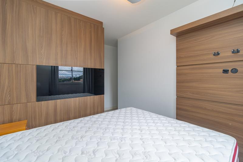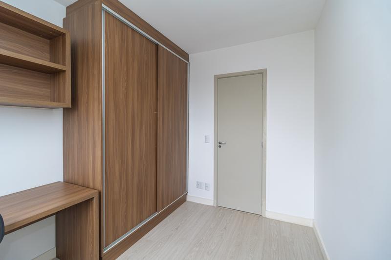 São 2 quartos, sendo uma suíte com armários, cabeceira e painel para TV. O segundo dormitório possui armários e bancada para estudos. Banheiro social com armário, espelho e box em vidro.