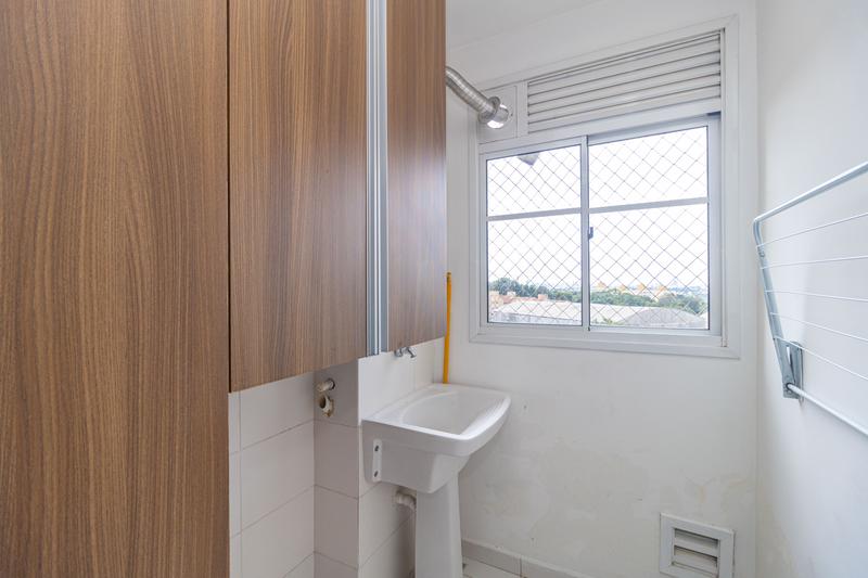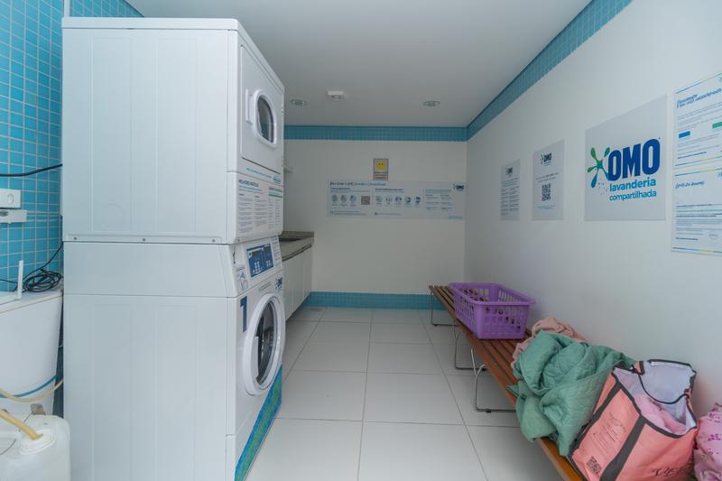A lavanderia é integrada à cozinha e conta com armários, máquina de lavar e secar, além de tanque.