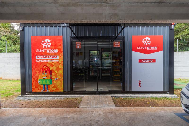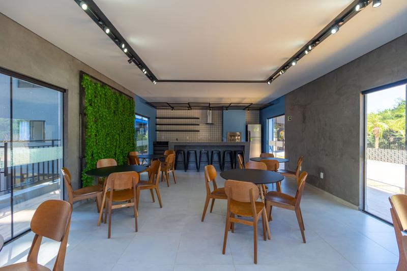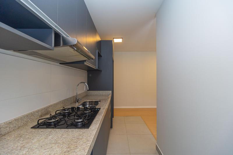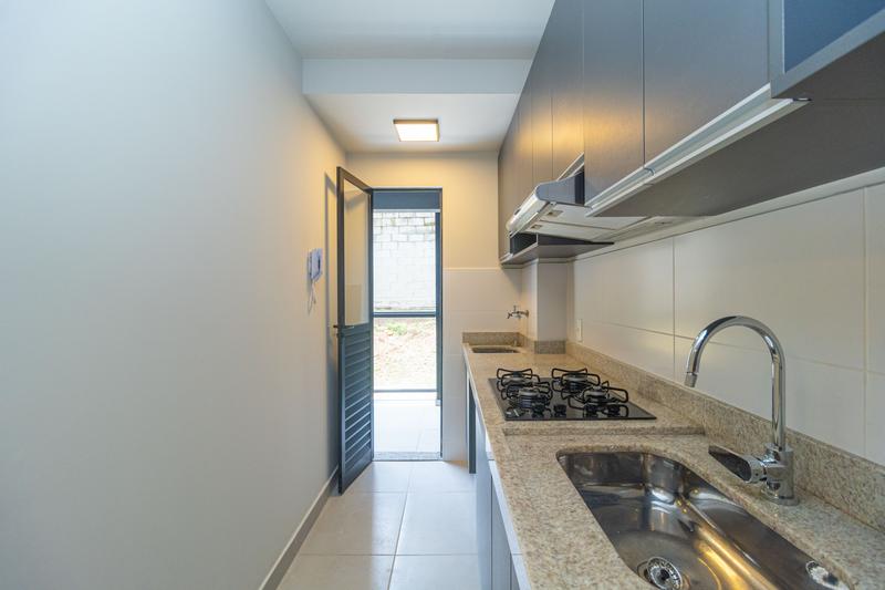 – Cozinha em conceito aberto, com móveis planejados, cooktop e depurador de ar,