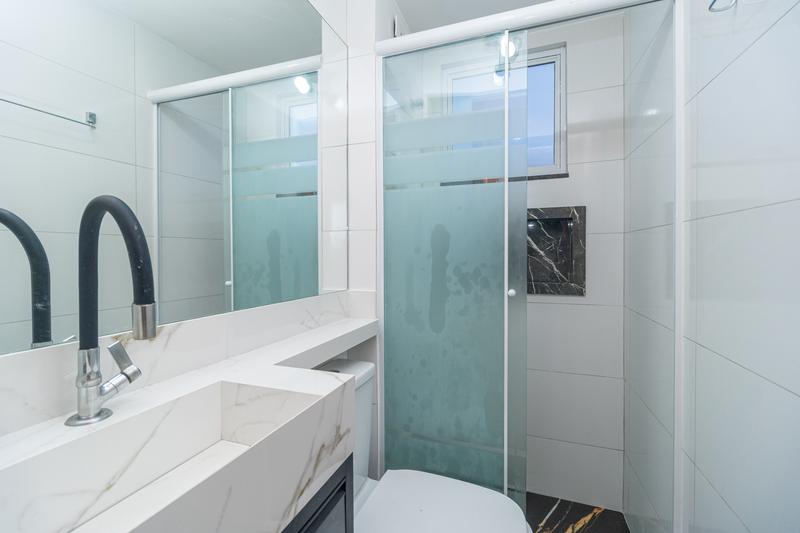 Dispõe de banheiro com armário, espelho e box em vidro, além de 2 quartos, sendo um com espaço para closet.