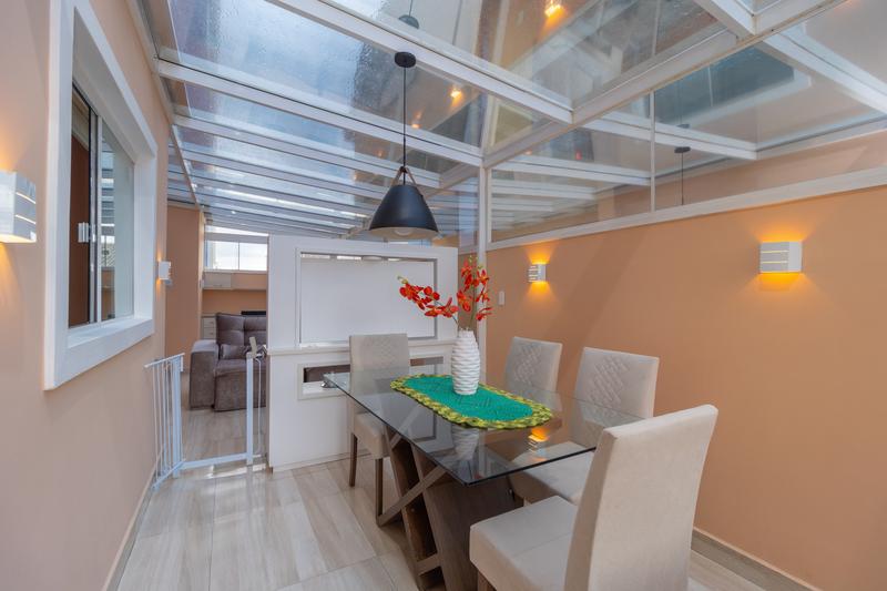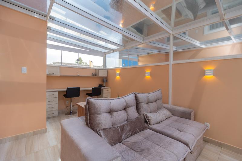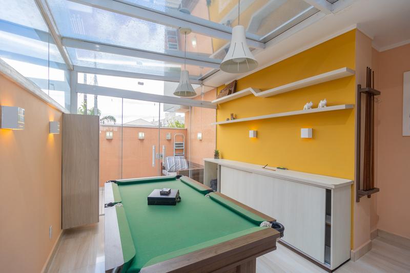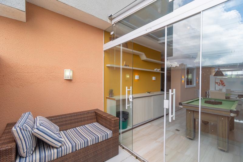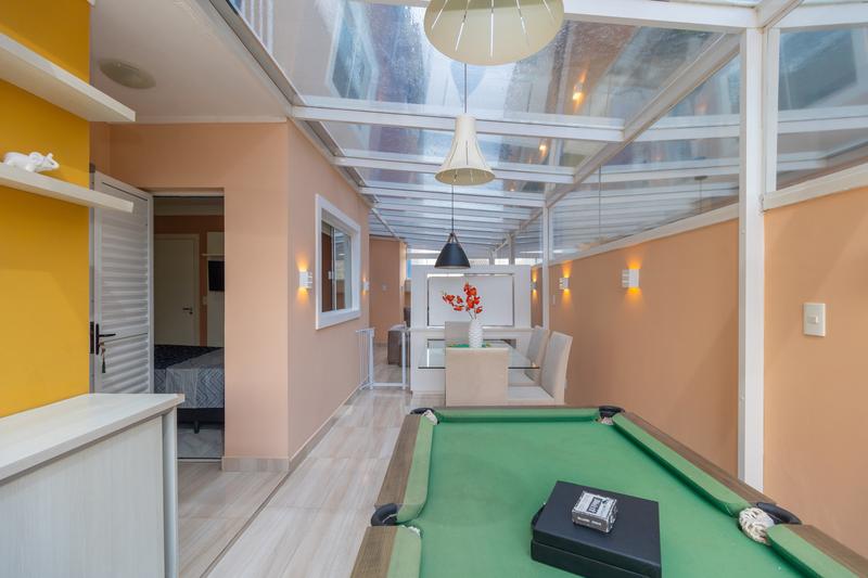 – Na parte externa com fechamento em vidro possui em um ambiente todo integrado, dividido em sala de estar com sofá e painel para TV, sala de jantar com uma mesa com tampo em vidro para 4 lugares, um espaço para estudos e ou home office com bancada e 2 cadeiras, armários, uma mesa de sinuca, e um pequeno espaço descoberto,
