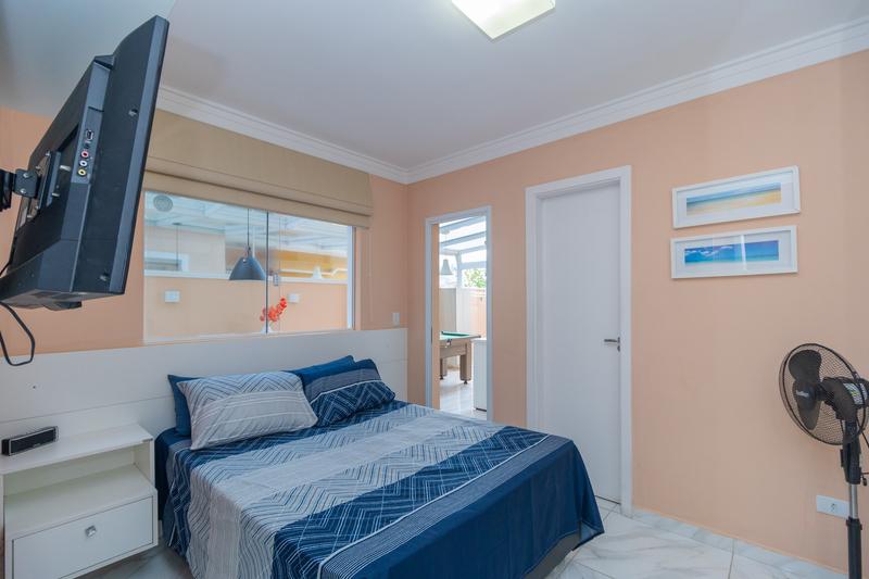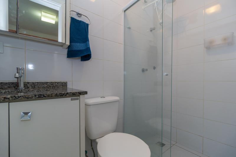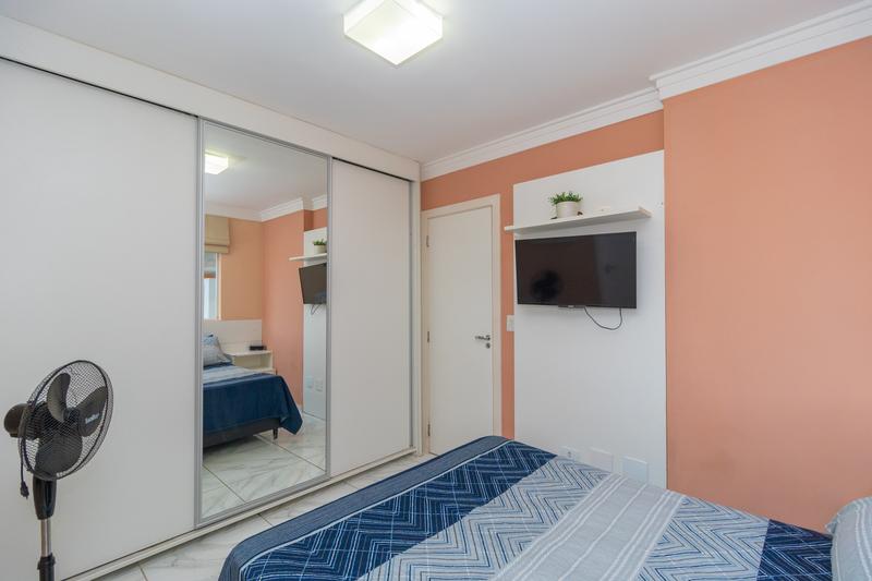– 1 suíte com armário, cabeceira, mesinha de cabeceira, painel com TV, no banheiro armário, espelho e box em blindex,