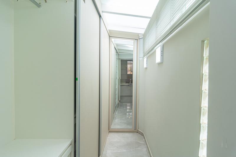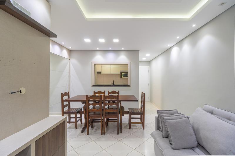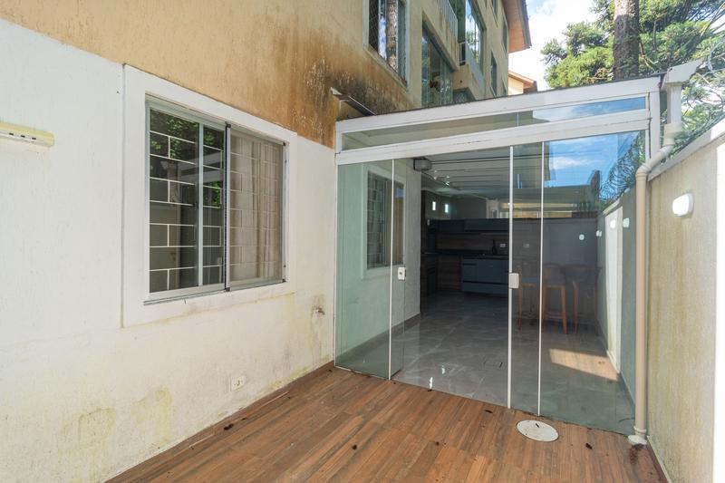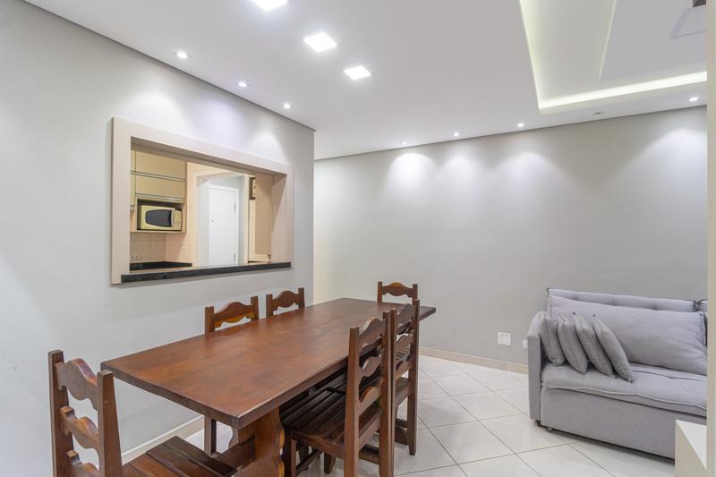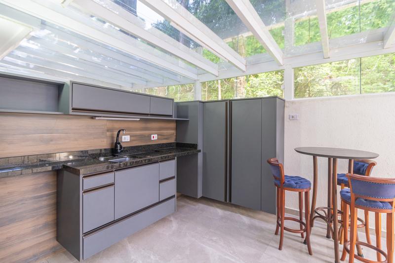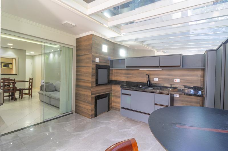 – Sala ampla para 2 ambientes, possui uma mesa, sofá retrátil, rack e painel para TV, acesso ao espaço externo do garden, parte coberta, possui teto retrátil com churrasqueira, armário, pia, e um espaço descoberto.