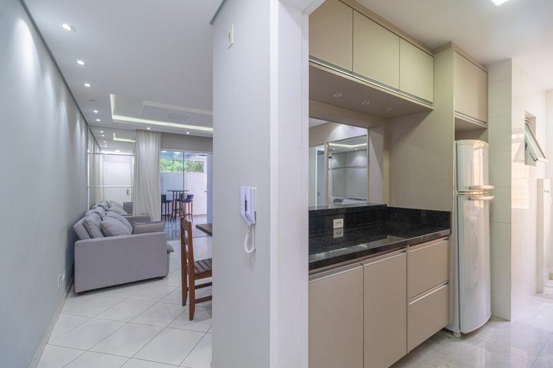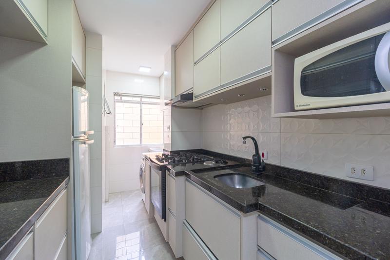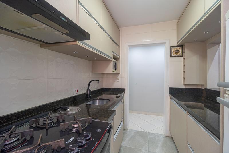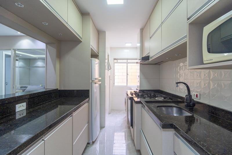 – Cozinha com armários planejados, geladeira, cooktop e microondas,