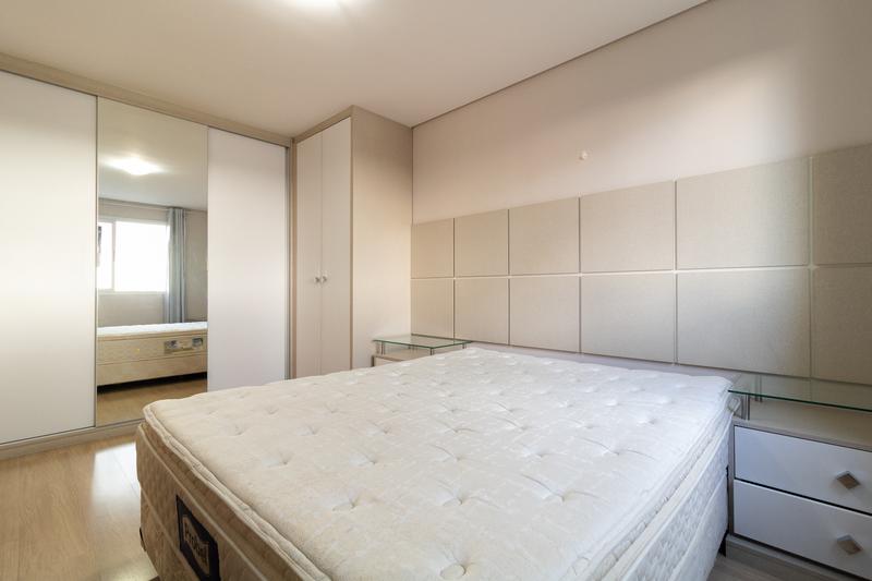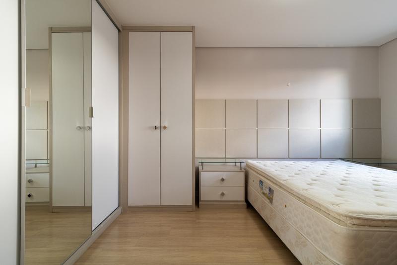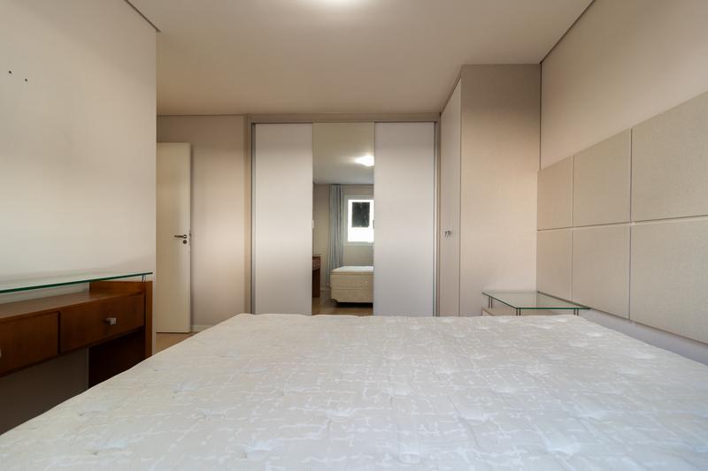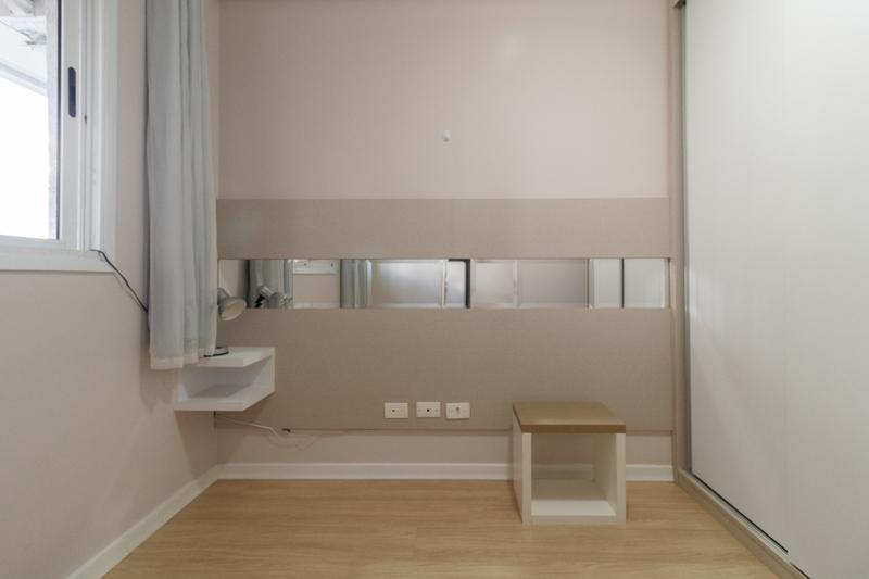 * Dois quartos, sendo uma suíte com cama box de casal nova, cabeceira, armário planejado, aparador com gavetas, cortinas e luminárias. O segundo dormitório conta com armário, cabeceira e criado-mudo.