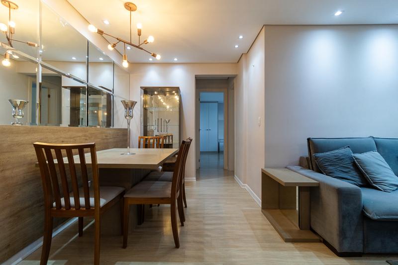 * Sala para dois ambientes com piso laminado novo, ar-condicionado, sofá, puf, painel para TV, rack, tapete, mesa de jantar com quatro cadeiras, luminárias decoradas, cristaleira e espelho grande.